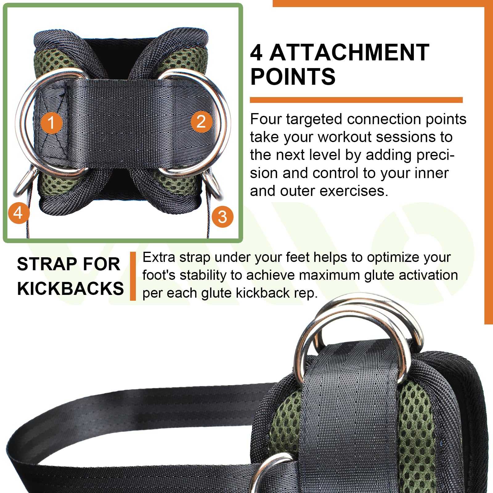 - ARTIFACT OF SPORTS BUFFS: These unique ankle straps will give you the legs of your dreams. Simply wear them and connect them to the cable machine, exercising your thighs, glutes, hips, hamstrings and calves through D-rings around the ankle. Let your legs get a full range of motion, the leg will be more muscular and slimmer!
