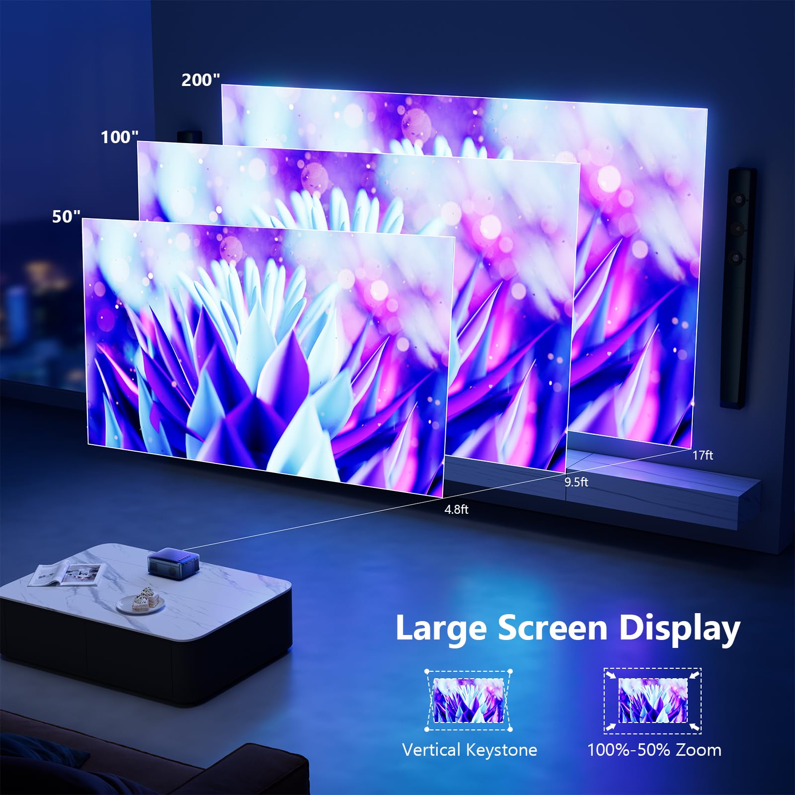 - Large Screen Experience : Featureing in a small size design, but it can display up to 200'. If you are enjoying watching movies or tv shows, or if you are a gamer, you may benefit from this projector. A large screen size can give you a more engaging and entertaining view excperience and allow you to see more of the game world and feel more involved in the action.