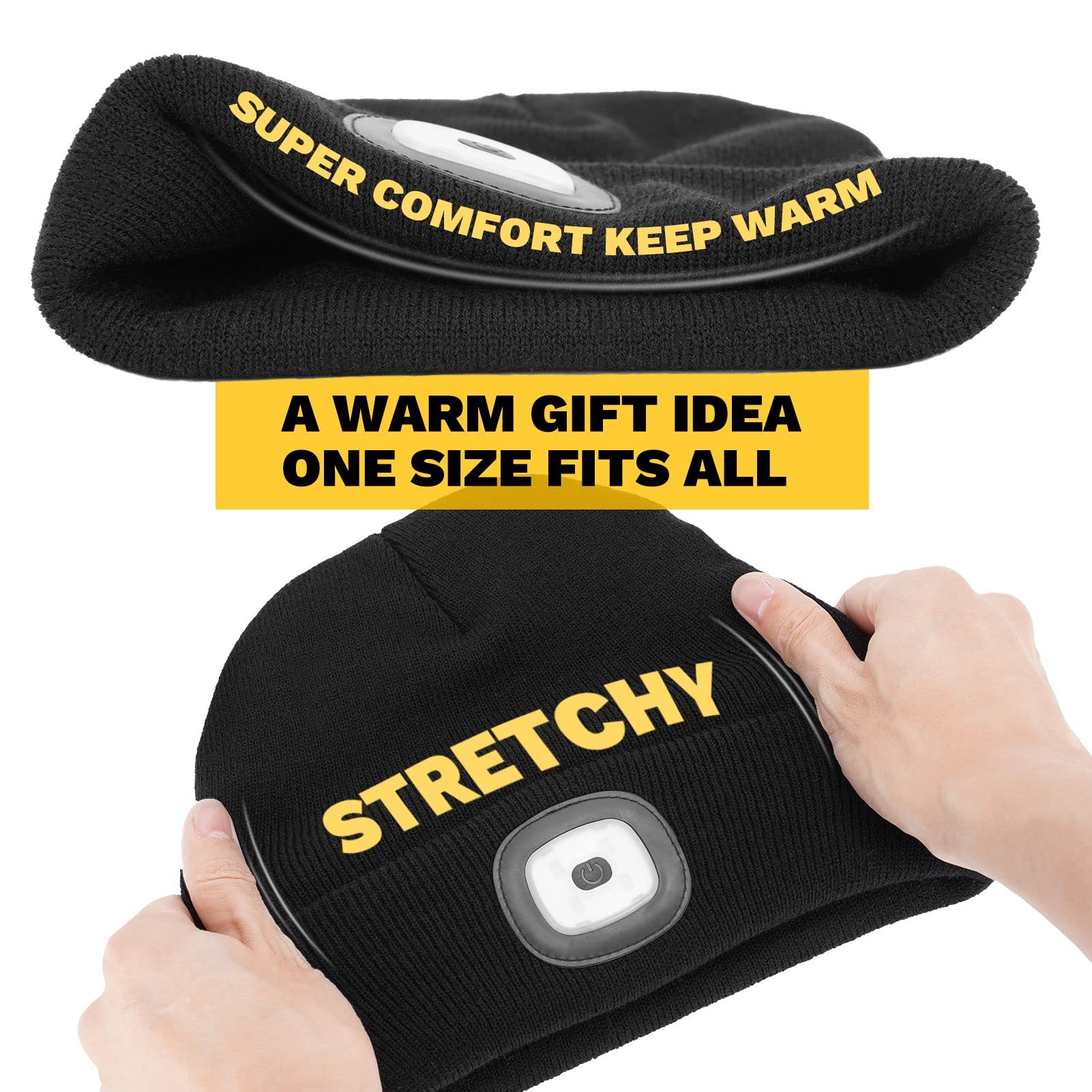 - Wide Application - This winter beanie with LED lights is One Size Fits All..LED hat light has elastic fits for most head sizes (size of hat:20*22cm), carefully designed, wear it, dog walking, jogging, skiing, biking, camping, hunting, fishing, hiking, running, handyman work, barbecuing, car repair and home improvement or any other activity that requires hands-free lighting.