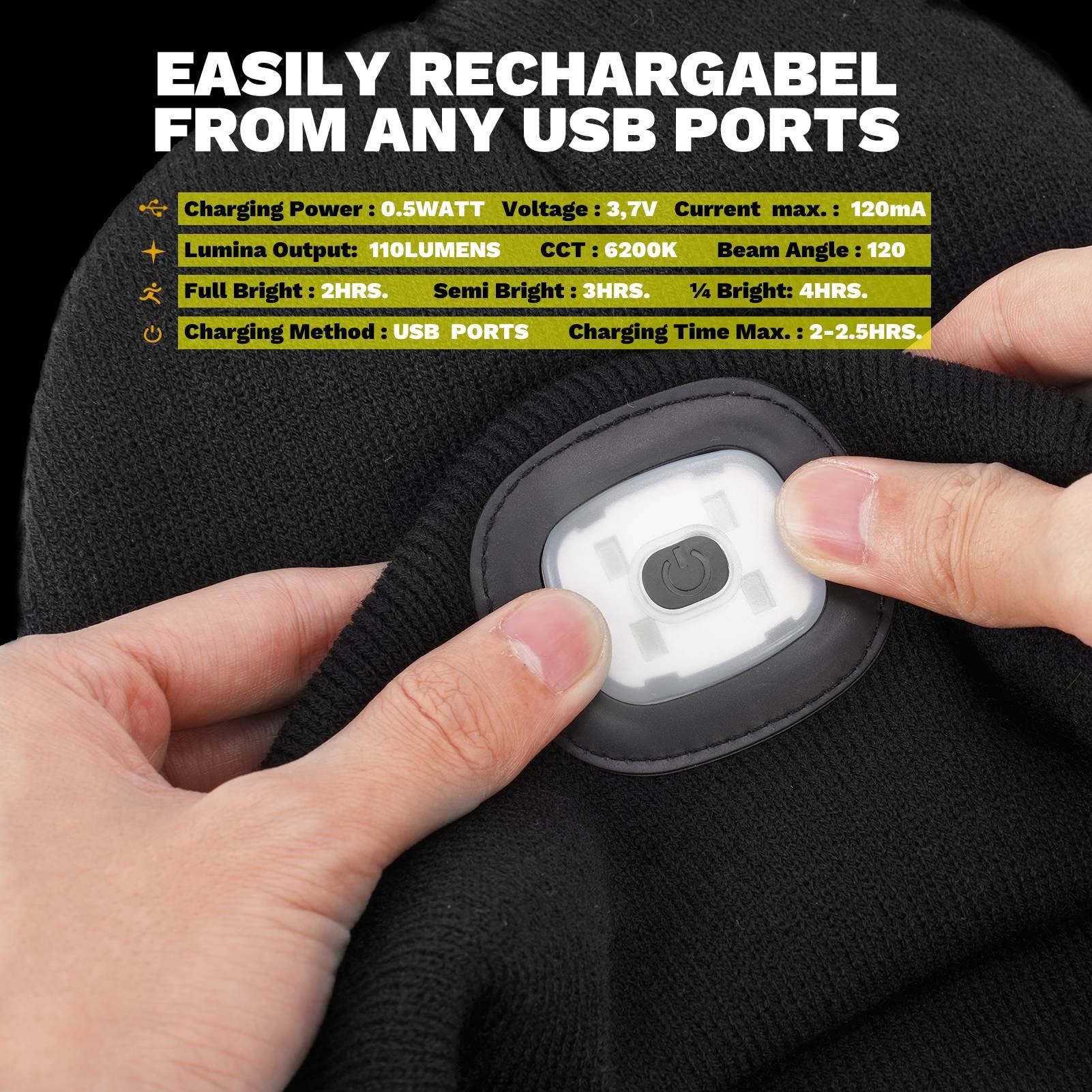 - Three-Brightness Adjustable - LED lights have a strong glow, and our Led beanie cap has three luminosity levels that you can adjust by pressing. On a full charge, it lasts four hours in low light, three hours in medium light and two hours in high light.
