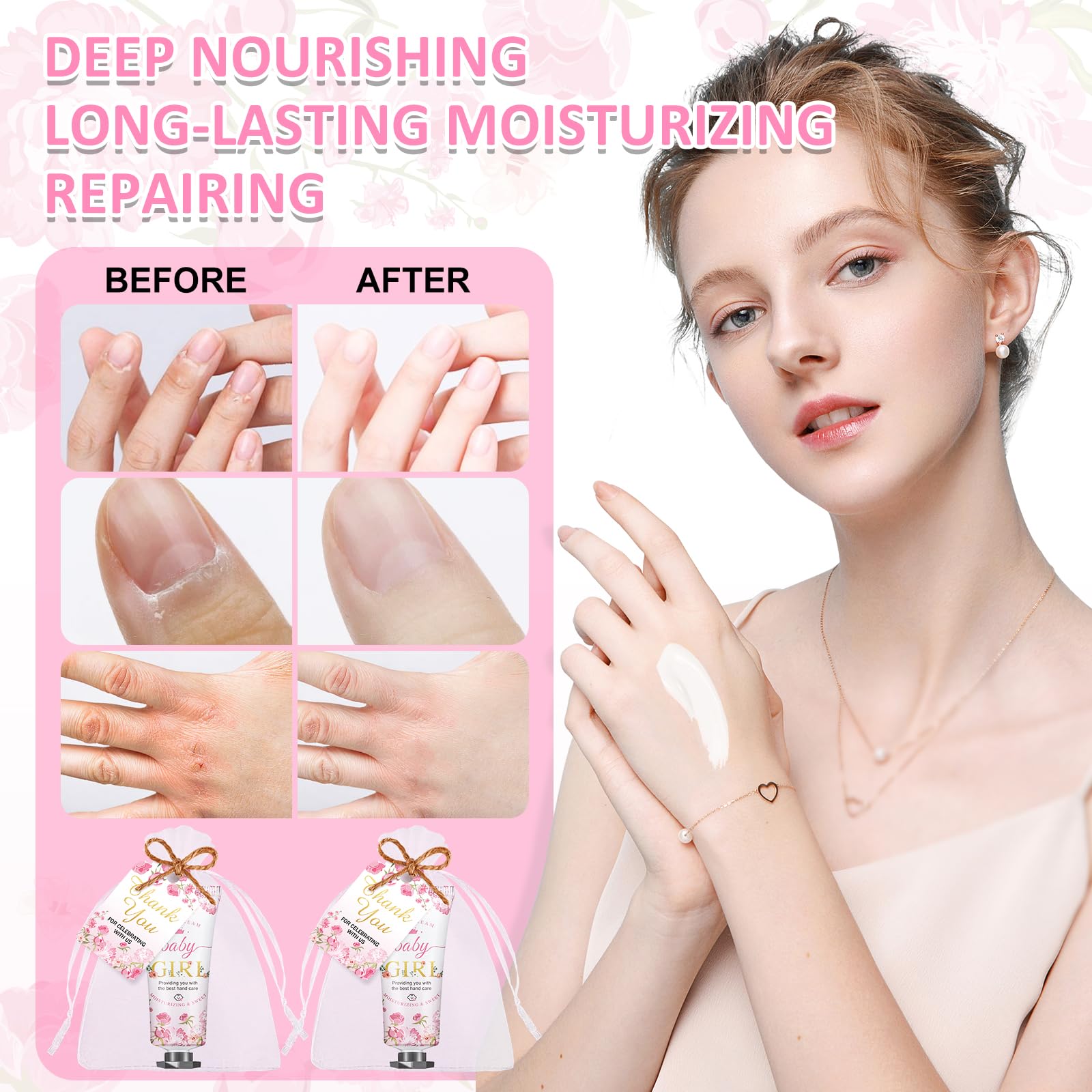 - 【Baby Hand Cream Gift Set】Our baby shower hand cream is the perfect baby shower thank you gifts at baby shower parties. The set includes 60 pcs cherry blossom flavored hand creams, 65 organza bags, and 65 thank-you tags, making it an ideal choice for baby showers, bridal showers, birthday parties, christmas, and thanksgiving, it is perfect baby shower gifts for game winner.