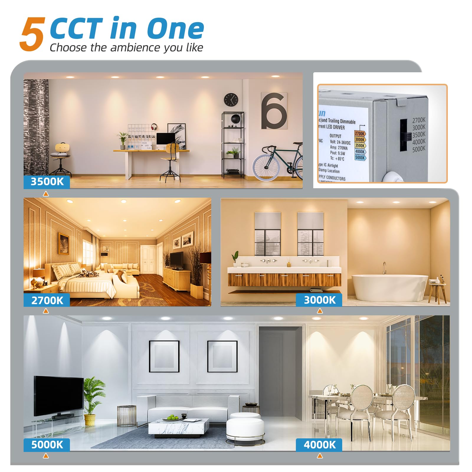 - 【5 Color Temperature】Just a slide on the side of the box, and freely choose 2700K/3000K/3500K/4000K/5000K-5 color temperature selectable to meet your mood, erasing the trouble of returning or replacing 6 inch led recessed light due to improper color temperature.