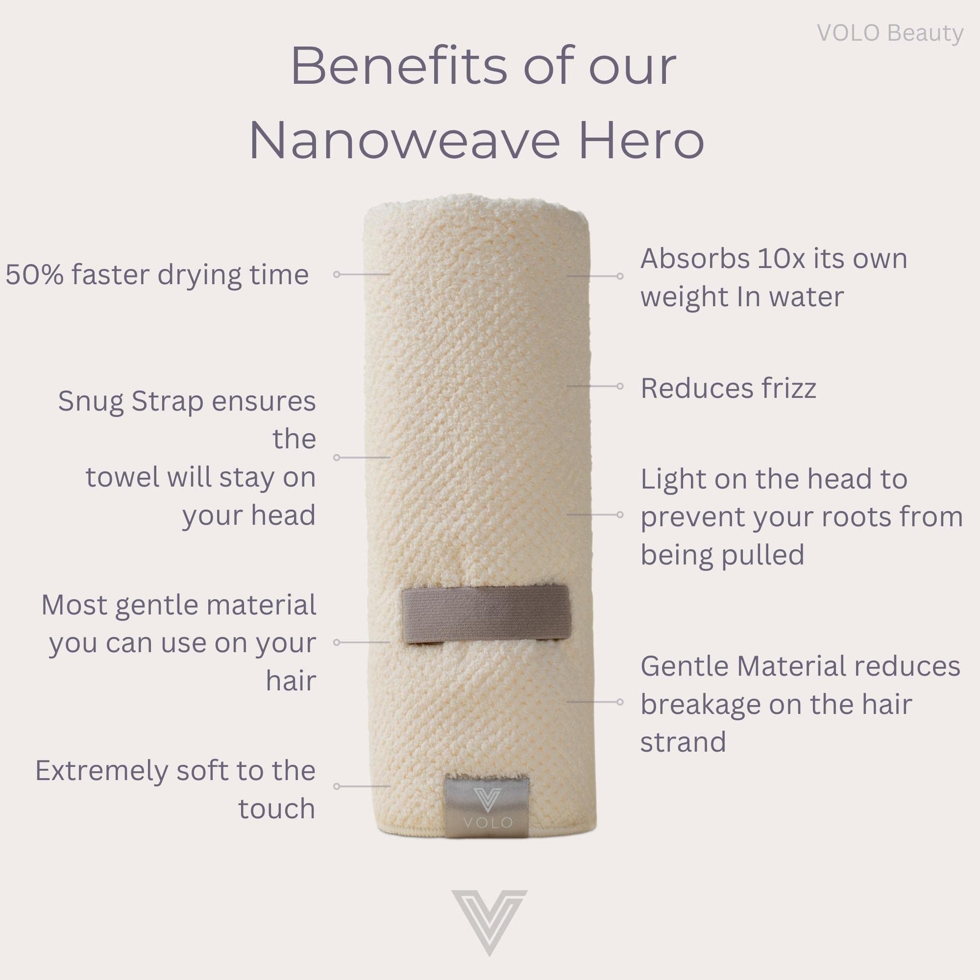 - MADE WITH NANOWEAVE: The VOLO hair towel is not like your old-school turban hair wraps. It's made from an extremely gentle, absorbent, next generation, microfiber fabric invented by and proprietary to VOLO Beauty, Nanoweave. Our Nanoweave fabric absorbs 10x its own weight in water, cuts your dry time by 50%, and works to gently and quickly remove moisture to prevent damage and breakage to hair.