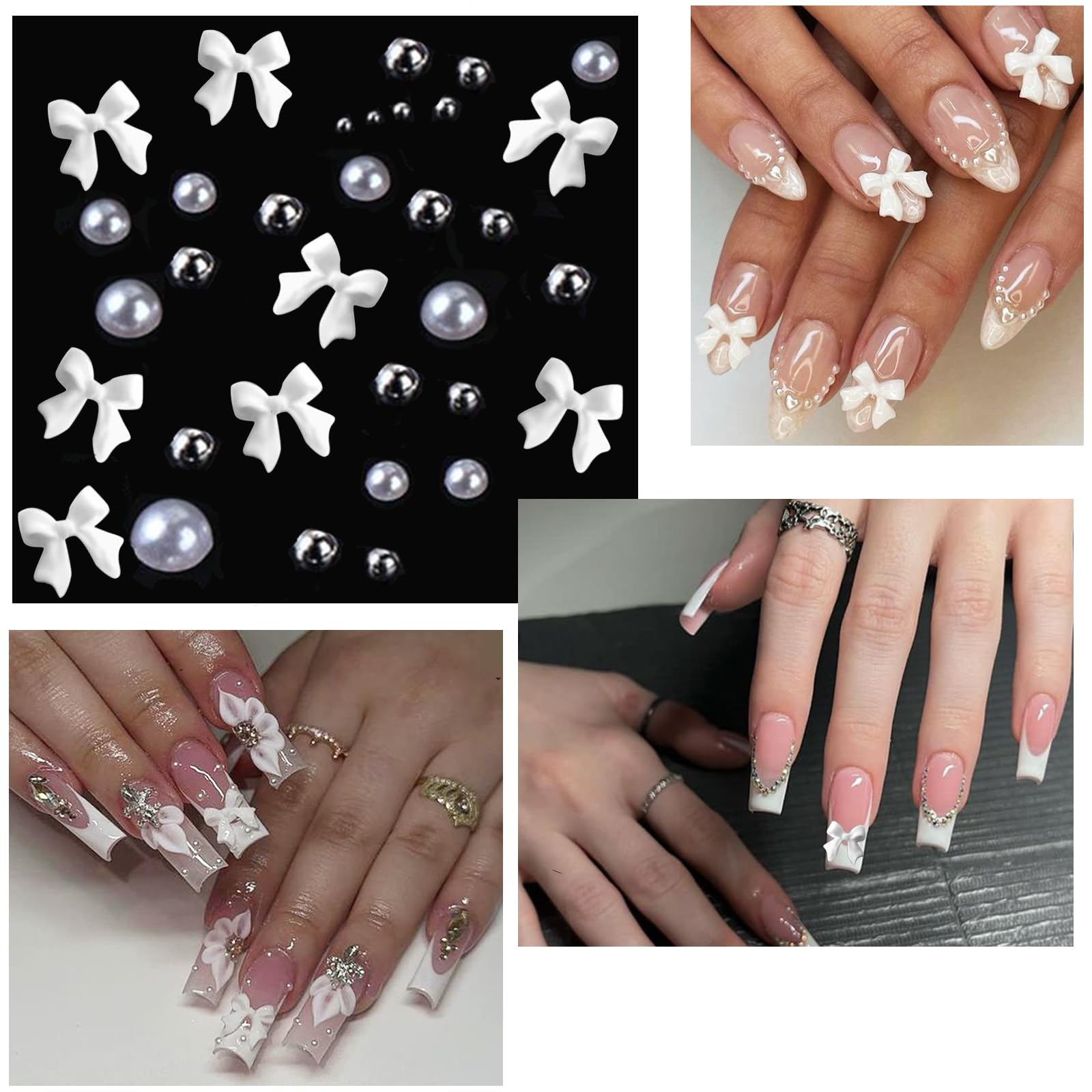 Votacos Nail Charms & Pearls - Bow-Knot Nail Accessories in Silver & White, Half Round Beads, Luxurious Design - DIY Crafts