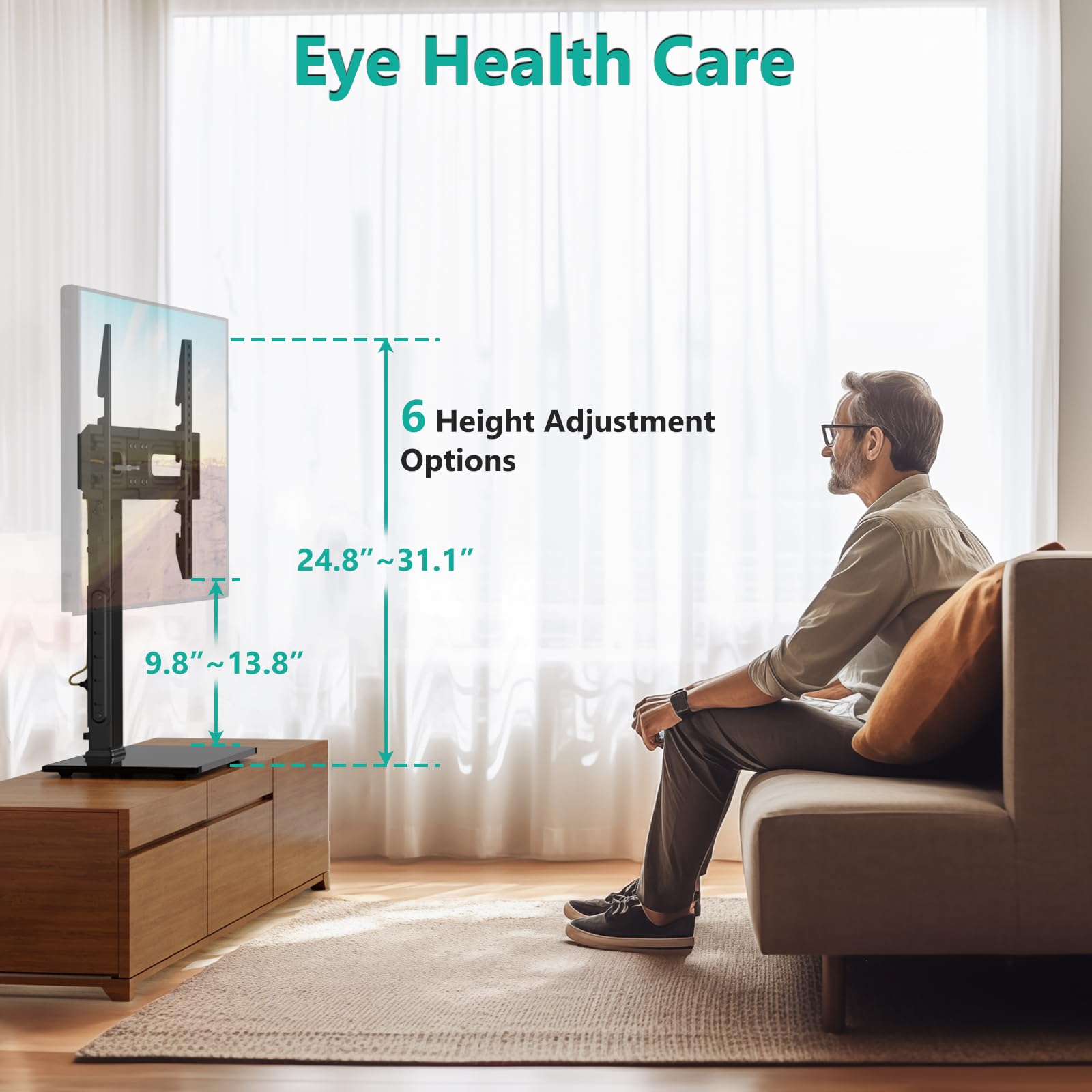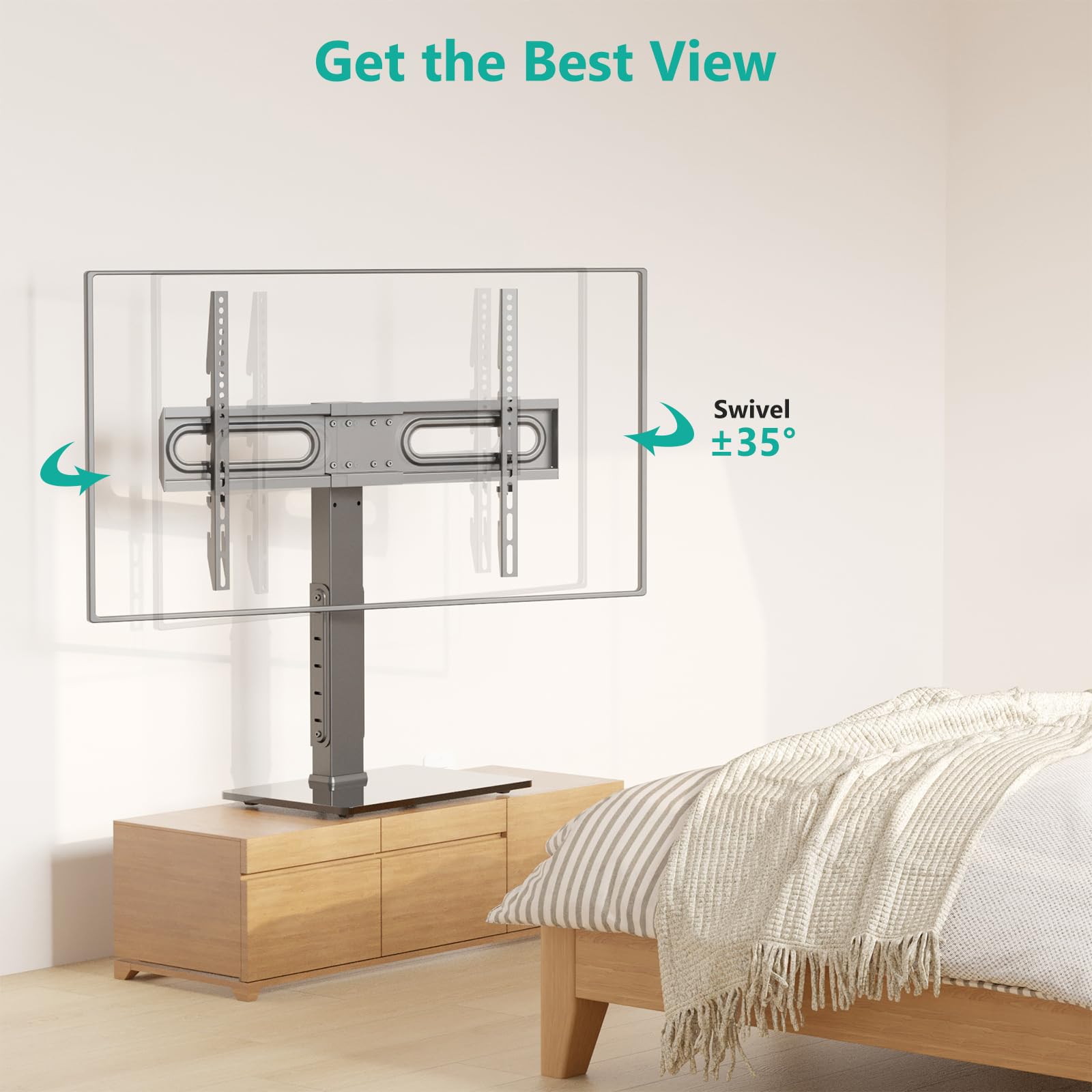 - VIEWING ANGLE SWIVEL 70°: Conveniently swivel your Floor TV stand +/-35° to the right or left, allowing for easy adjustment of the screen direction and ensuring the best viewing angle from anywhere in the room