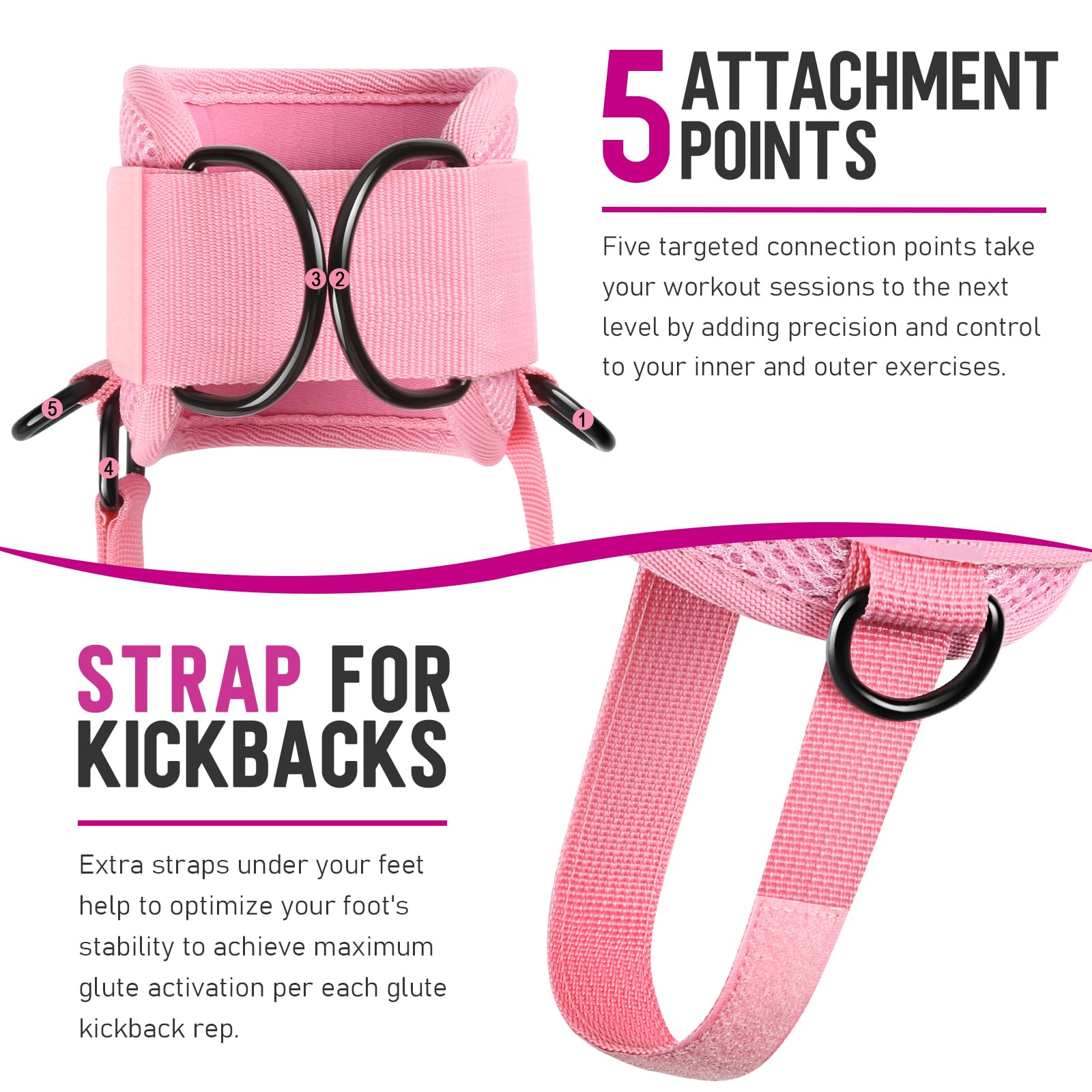- 【Upgrated Practical Ergonomic Cuff Design】To achieve maximum glute activation per rep, we created the most ergonomic ankle cuff ever made. New added an extra strap to fix the ankles cable cuff on your ankle doesn't slide up-down. 5 D-shaped buckles design helps you avoid moving the foot buckle frequently when changing movements, letting you better focus on intense workout sessions.