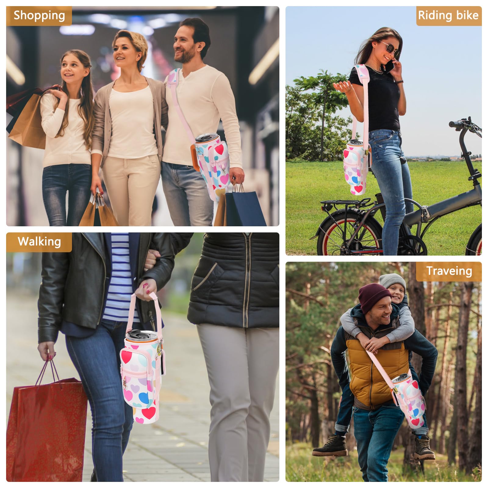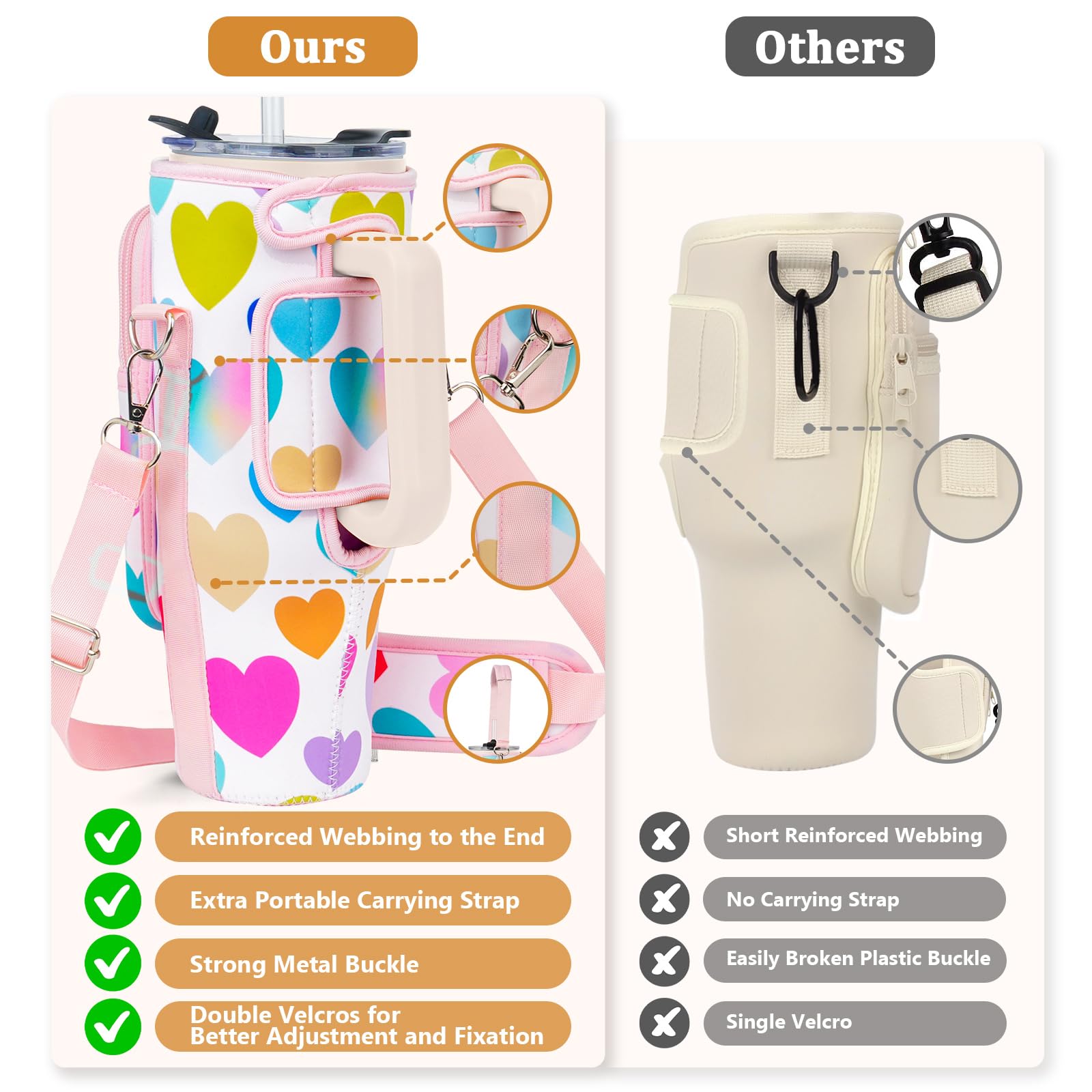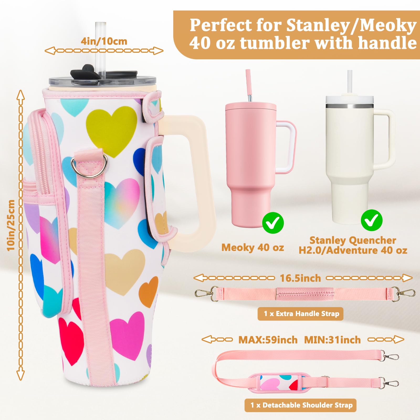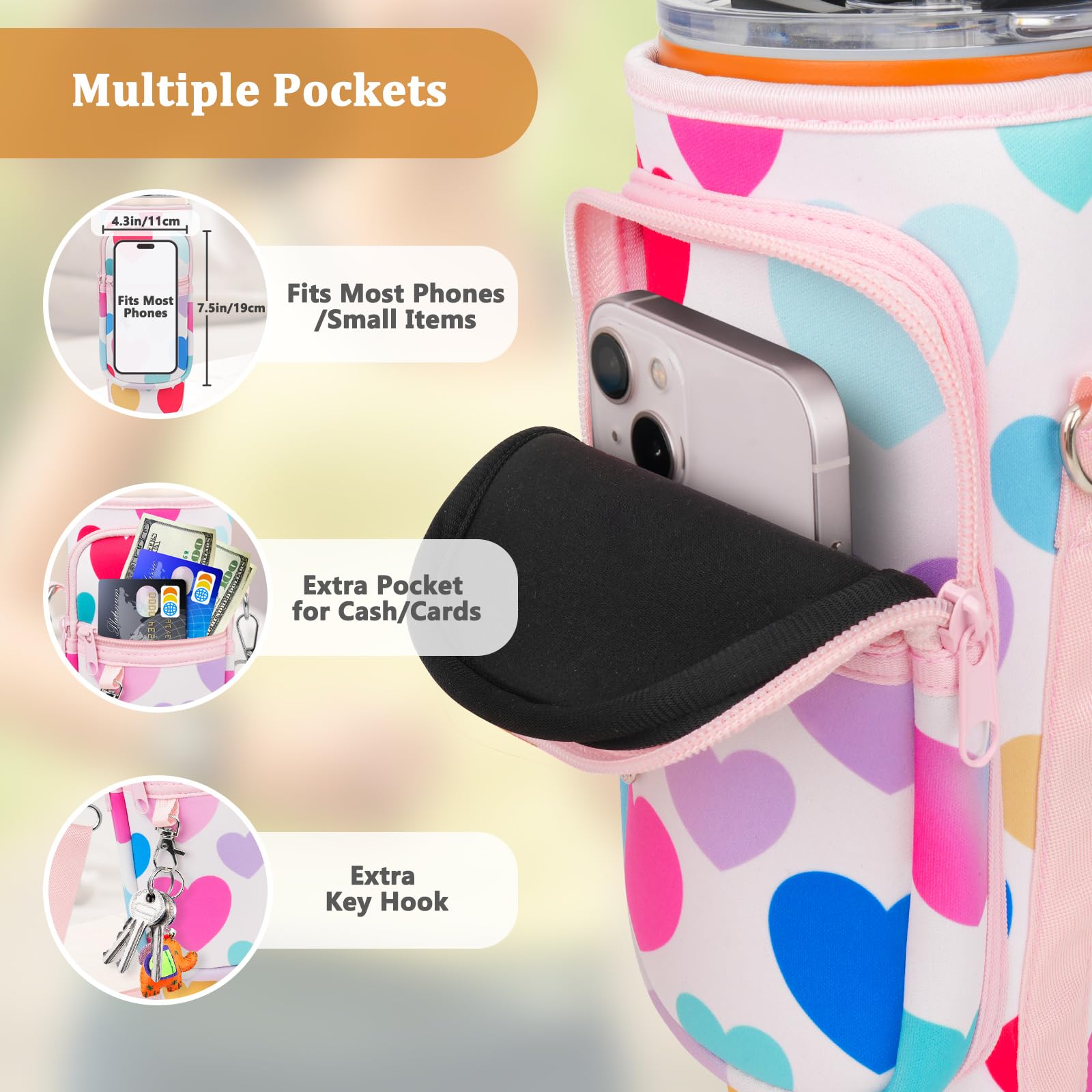 Details: Water Bottle Carrier Bag with Phone Pocket Compatible for Stanley/Meoky 40 oz Tumbler with Handle,Neoprene Water Bottle Holder Pouch with Adjustable Strap Compatible for Stanley Cup Accessories,Heart Print