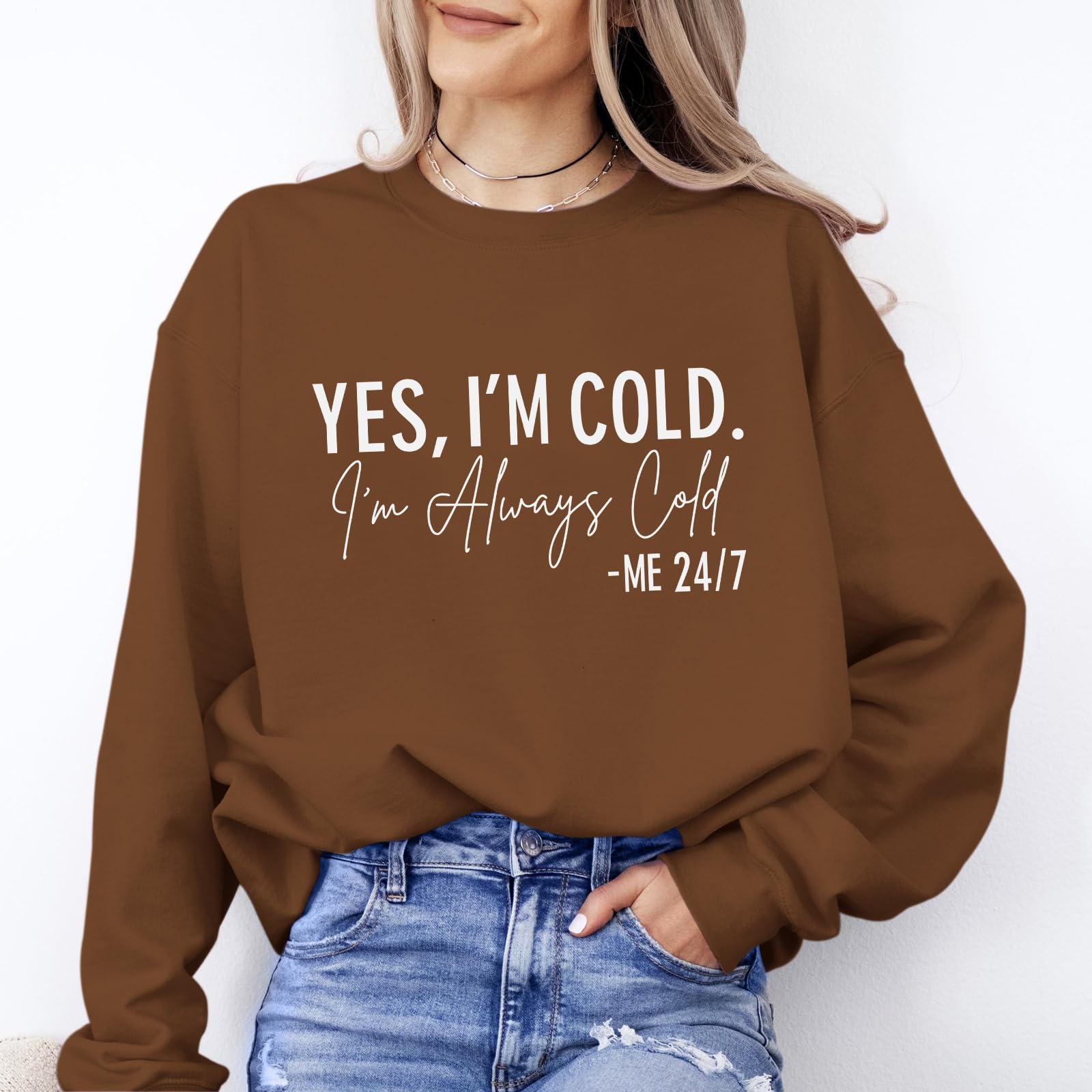 Weetiotio Yes I'M Cold Me 24/7 Always Cold Sweatshirt For Women Crewneck Winter Freezing Sweatshirts Oversized Pullover Hoodie(Brown,M)