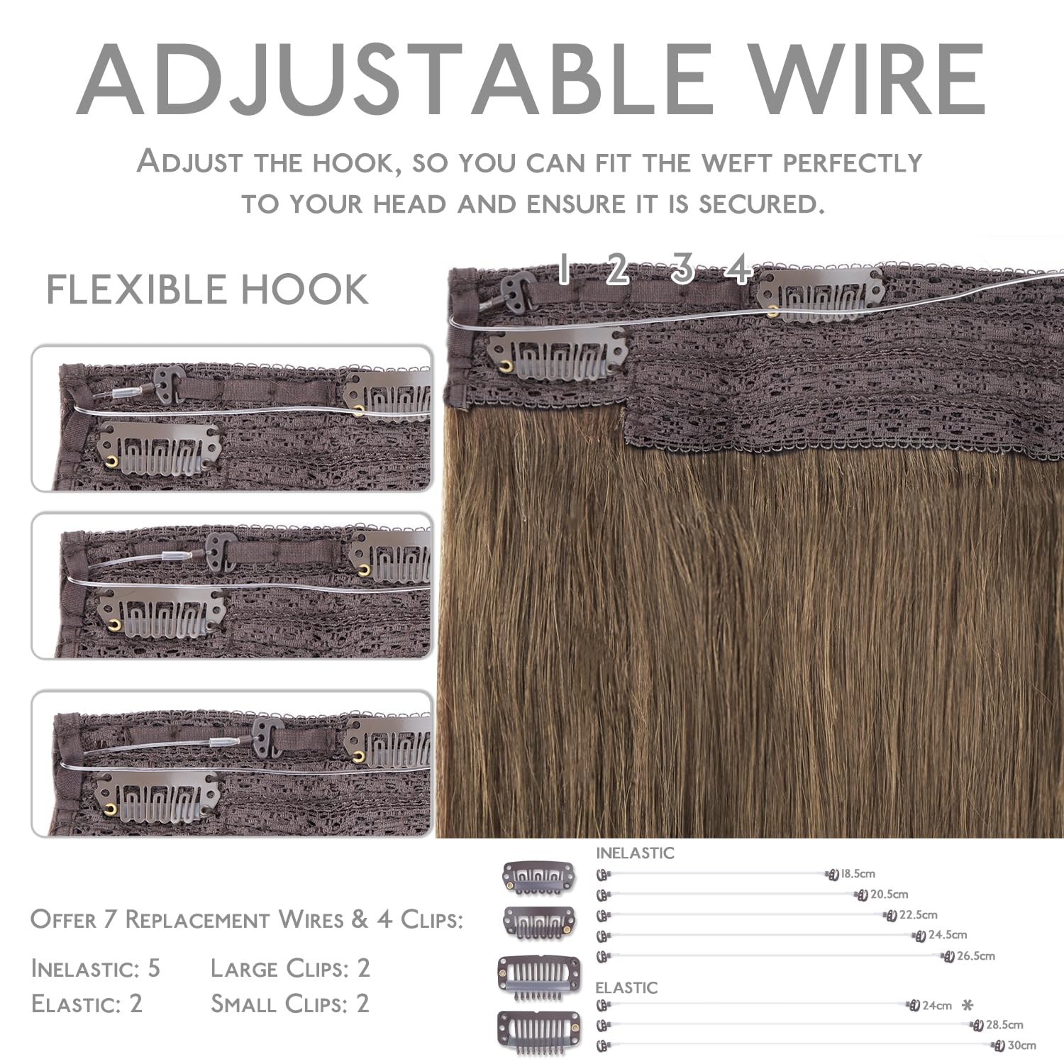 - 【Easy to Wear & Firm Hold】12':100g, 14':105g, 16'-18': 125g, 20':140g. Wire hair extensions real human hair are super easy to apply and remove, you can add volume and length to your hair in just 1 minute. It can blend perfectly with your hair with the adjustable invisible transparent wire and the clips on the lace weft. Gently touch your head, they will not move when you shake your head. The 10-inch weft is the most proper distance for the majority, it can prevent your ears from being rubbed.