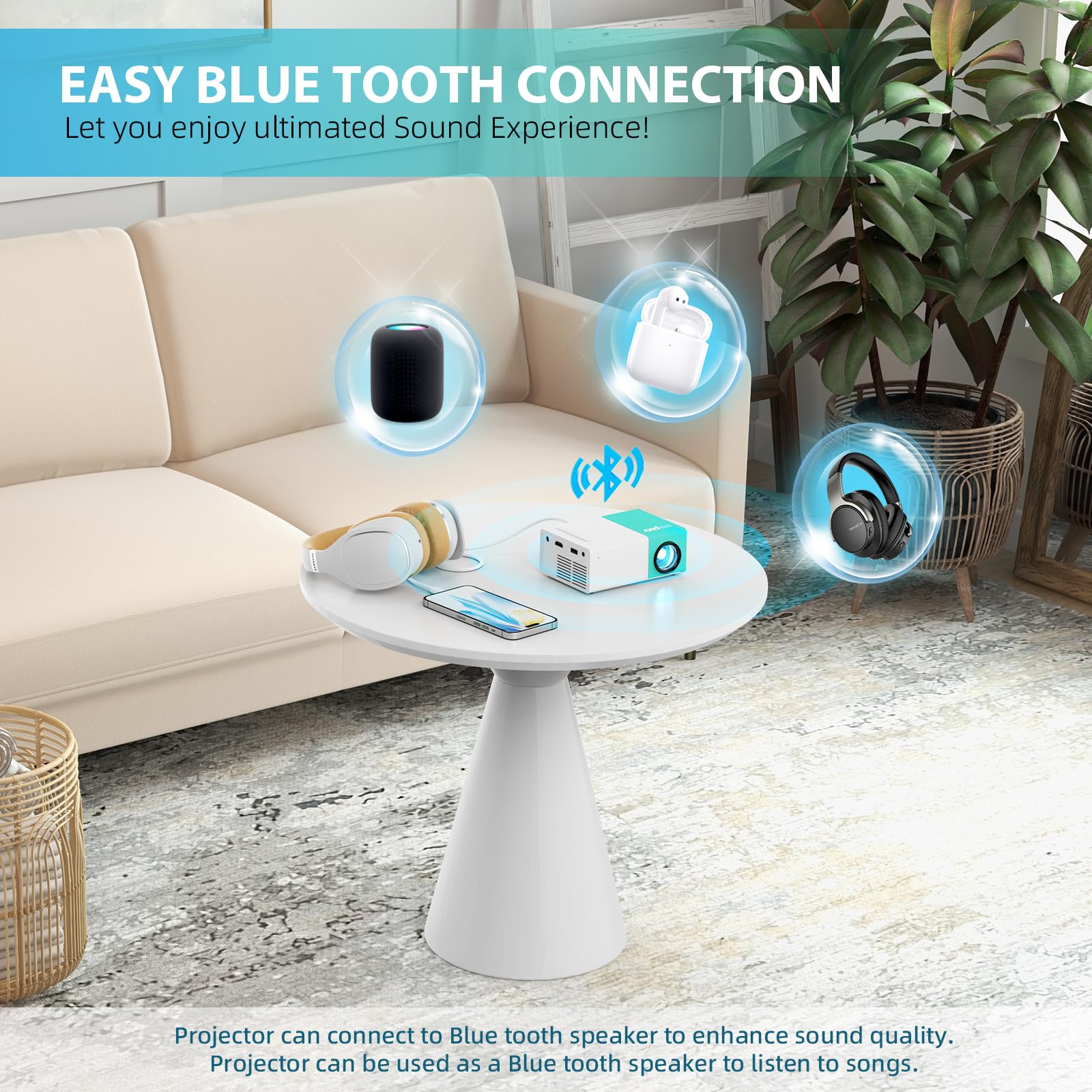 - Bluetooth 5.4 audio: With built-in stereo speaker, you can enjoy a cinematic audio-visual experience without connecting external speakers. Also, this mini projector built-in bluetooth 5.4 technology to make the audio synchronization faster and more stable. With this bluetooth projector, you can connect your ideal bluetooth speakers or headphones wirelessly at any time to get more wonderful sound. Please Note: Bluetooth connection is only for audio transmission with audio devices (bluetooth speakers or bluetooth headphones etc.), which cannot be used on smartphone screen mirroring.