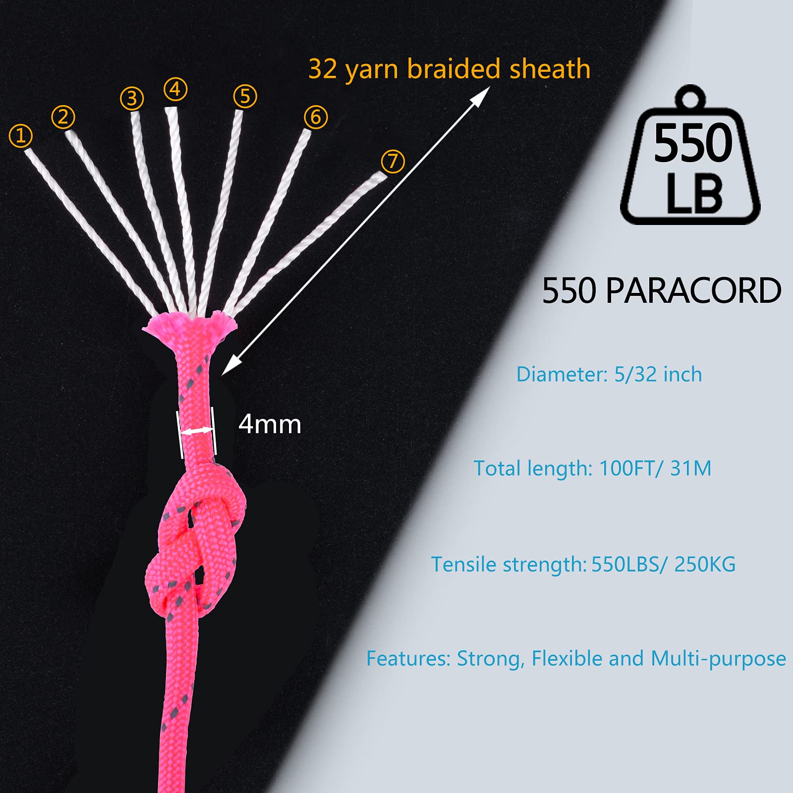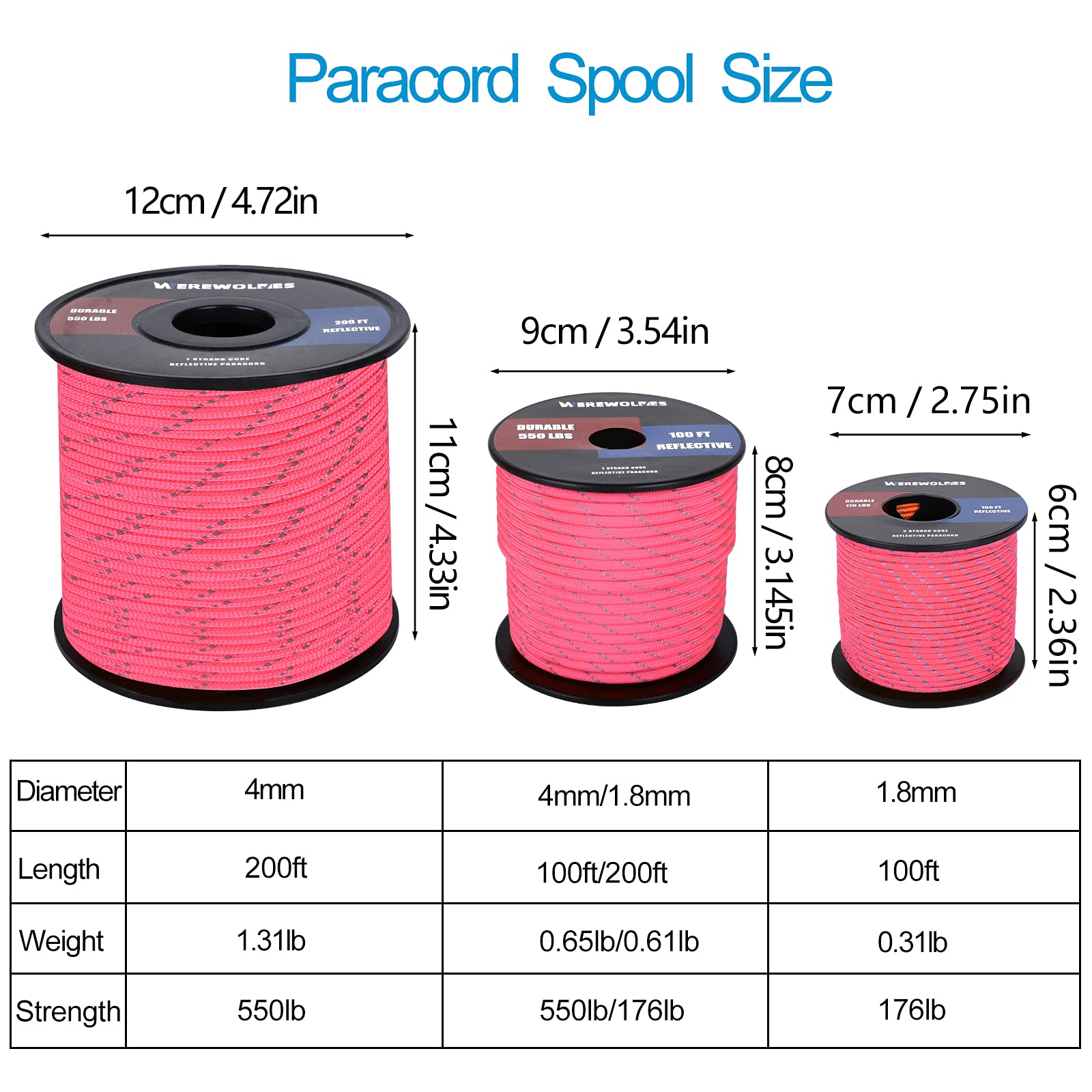 - High quality: The reflective paracord with a diameter of 4mm is 7 strands, the average pulling force exceeds 550 pounds, and the reflective paracord with a diameter of 1.8mm is 3 strands, the average pulling force exceeds 176 pounds. The reel made of polymer nylon plastic will make you use the parachute rope very simple and easy to carry and store.