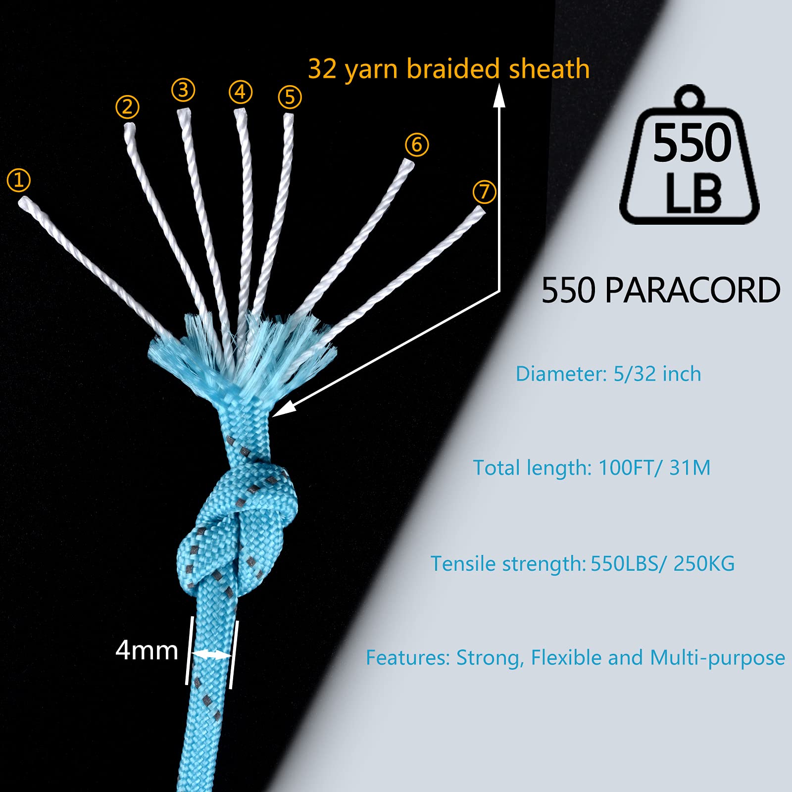 - High quality: The reflective paracord with a diameter of 4mm is 7 strands, the average pulling force exceeds 550 pounds, and the reflective paracord with a diameter of 1.8mm is 3 strands, the average pulling force exceeds 176 pounds. The reel made of polymer nylon plastic will make you use the parachute rope very simple and easy to carry and store.