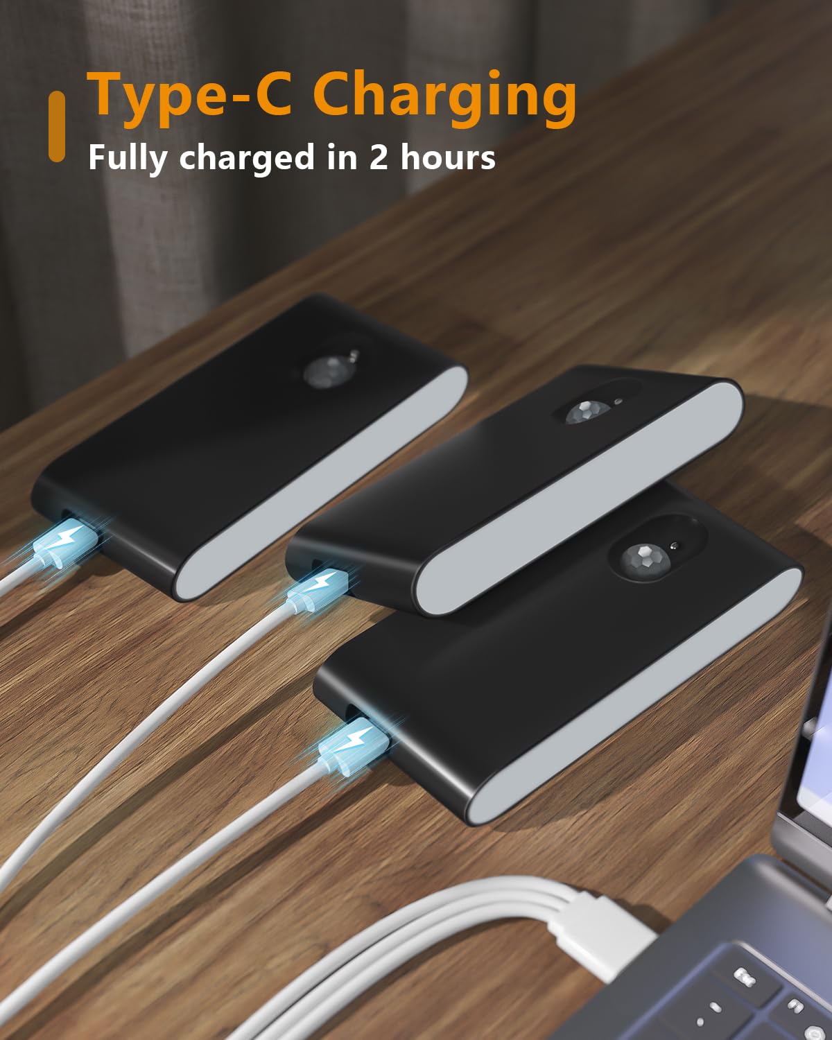 - [Rechargeable & Energy Saving] - The stair lights indoor has a built-in 500mAh large rechargeable battery, no need to buy extra batteries, environmentally friendly and save money. In always-on mode, our motion sensor night light can be used continuously for 16 hours. In motion sensor mode, they can be used for up to 2 months. Charge 3 night lights at the same time with 3 in 1 Type-C cable, super convenient and saving up to 80 AA dry cell batteries per year per light.
