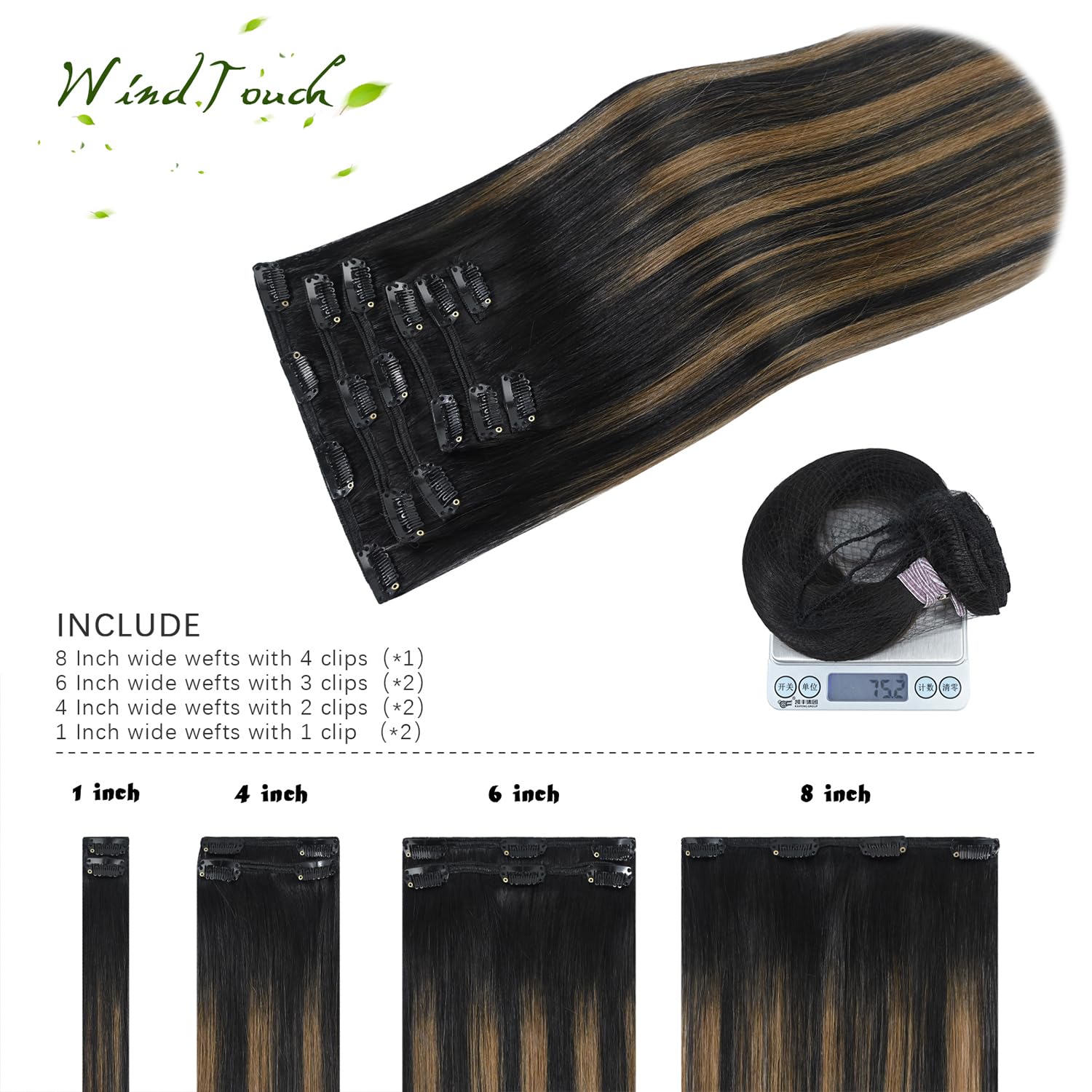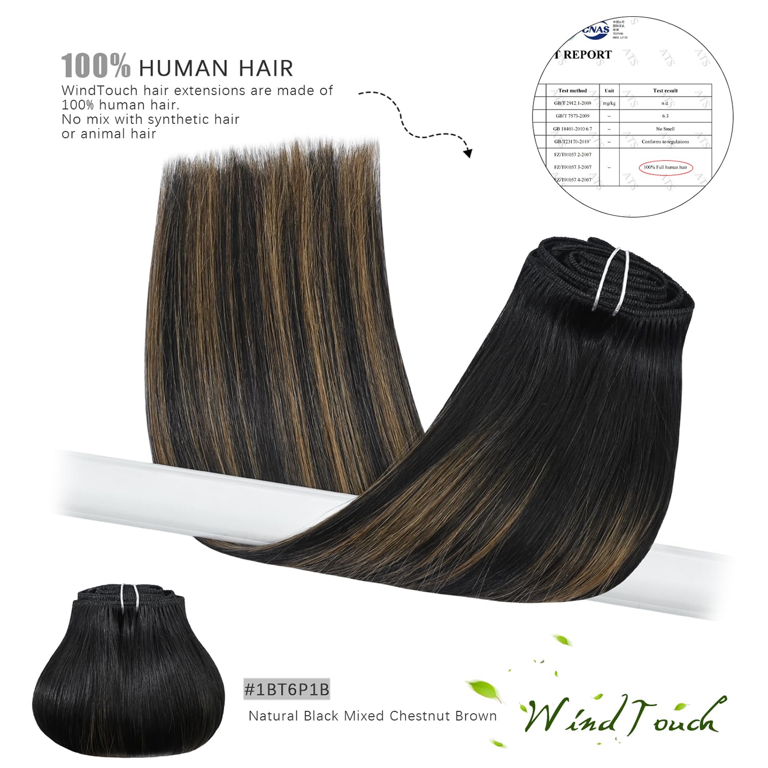 WindTouch Clip in Hair Extensions Human Hair Balayage Natural Black to Chestnut Brown Highlights for Black Hair 12Inch 75g #1BT6P1B 7PCS