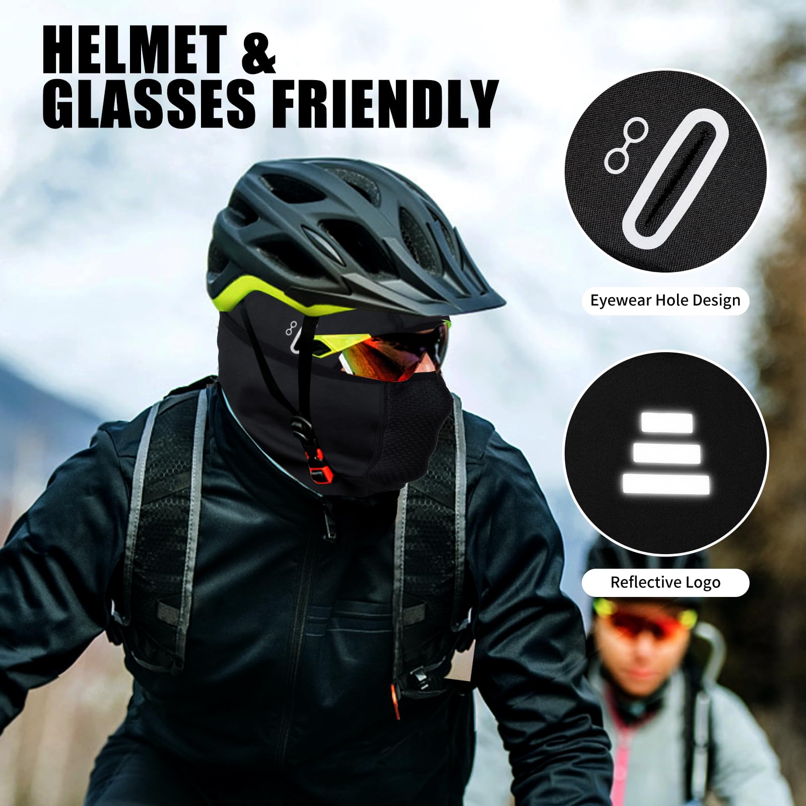 - EYEGLASSES HOLE & REFLECTIVE LOGO:We've designed eyeglass holes on both sides of the Balaclava mask to make it easy for you to wear nearsighted glasses and goggles, and reflective logos printed on the left side and back to keep you safer when riding at night.