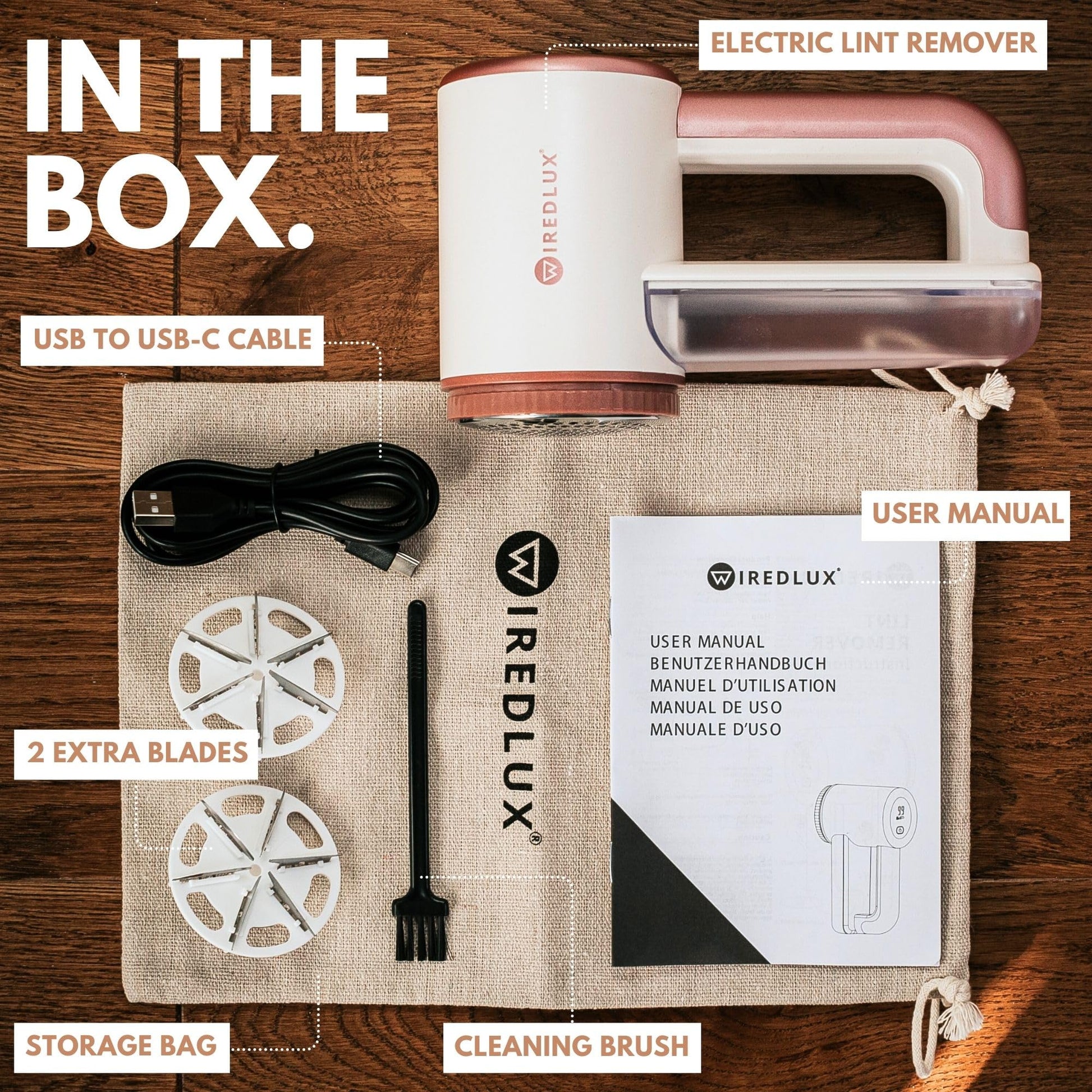 - 【INCLUDED IN THE BOX】This pilling remover for clothes is sold with the following accessories: (x1) bag for storage and transport, (x1) USB to USB-C cable, (x2) extra blades, (x1) brush to clean the blades, (x1) user manual.