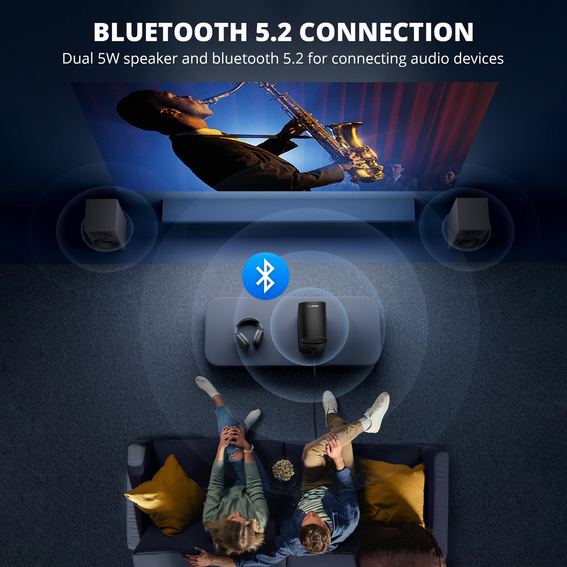 - Two Audio Options as Movie projector: This movie projector is equipped with 2*5W speakers and Bluetooth 5.2 functionality, providing a big and clear sound experience with its internal speaker. Additionally, it is easy to connect to other audio devices for enhanced sound quality via Bluetooth.