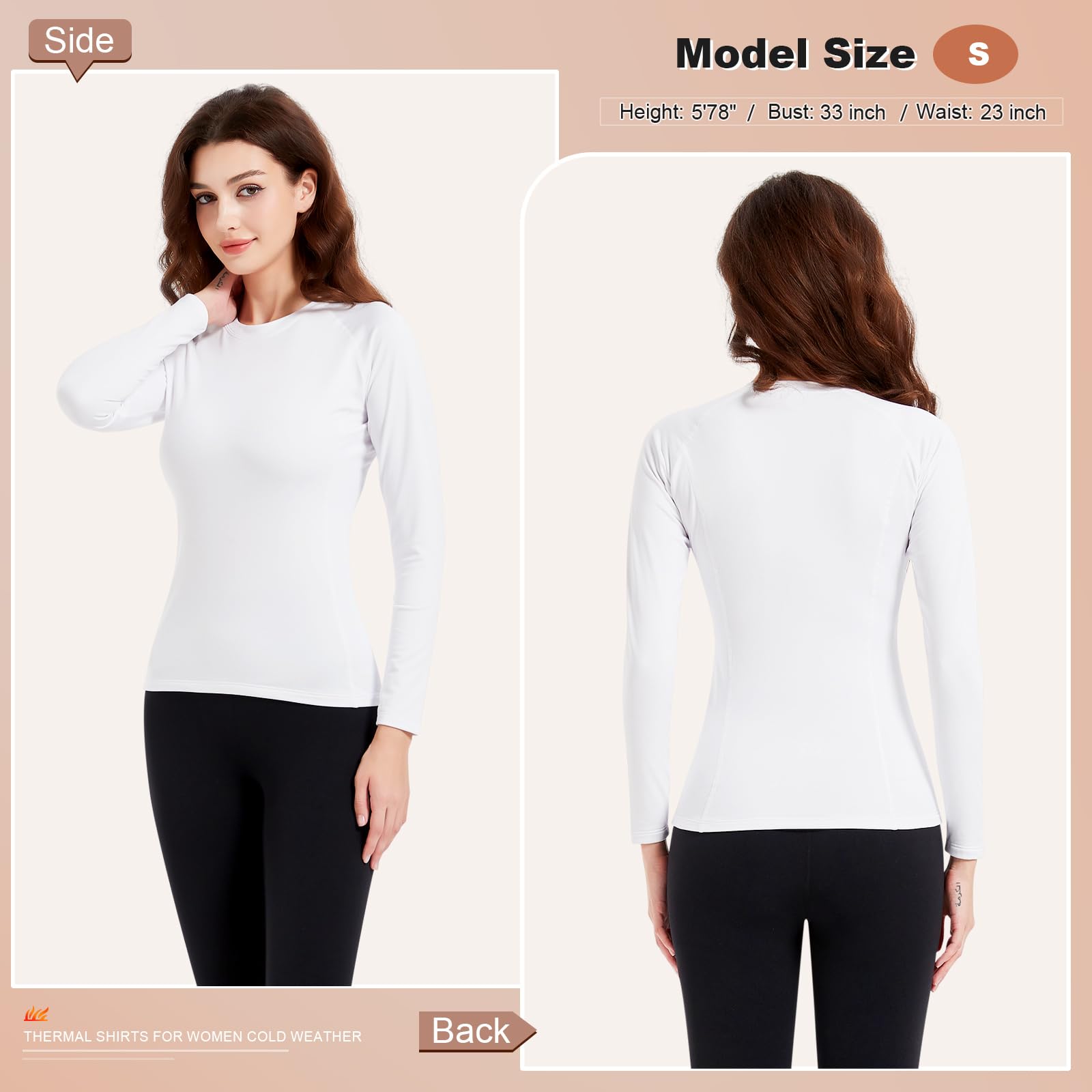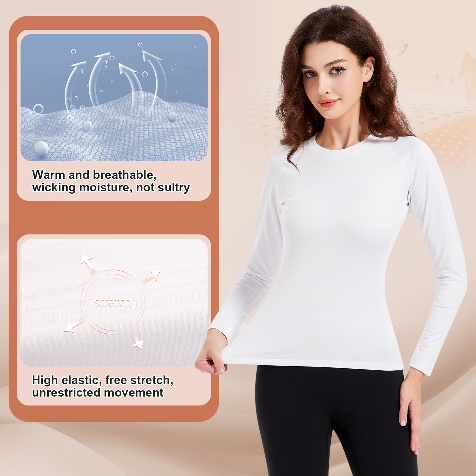 Witkey Thermals for Women Long Sleeve Shirts Cold Weather Crew Neck Fitted Fleece Lined Baselayer Tops Lightweight Winter Clothing Workout Running Hiking Quick Dry White