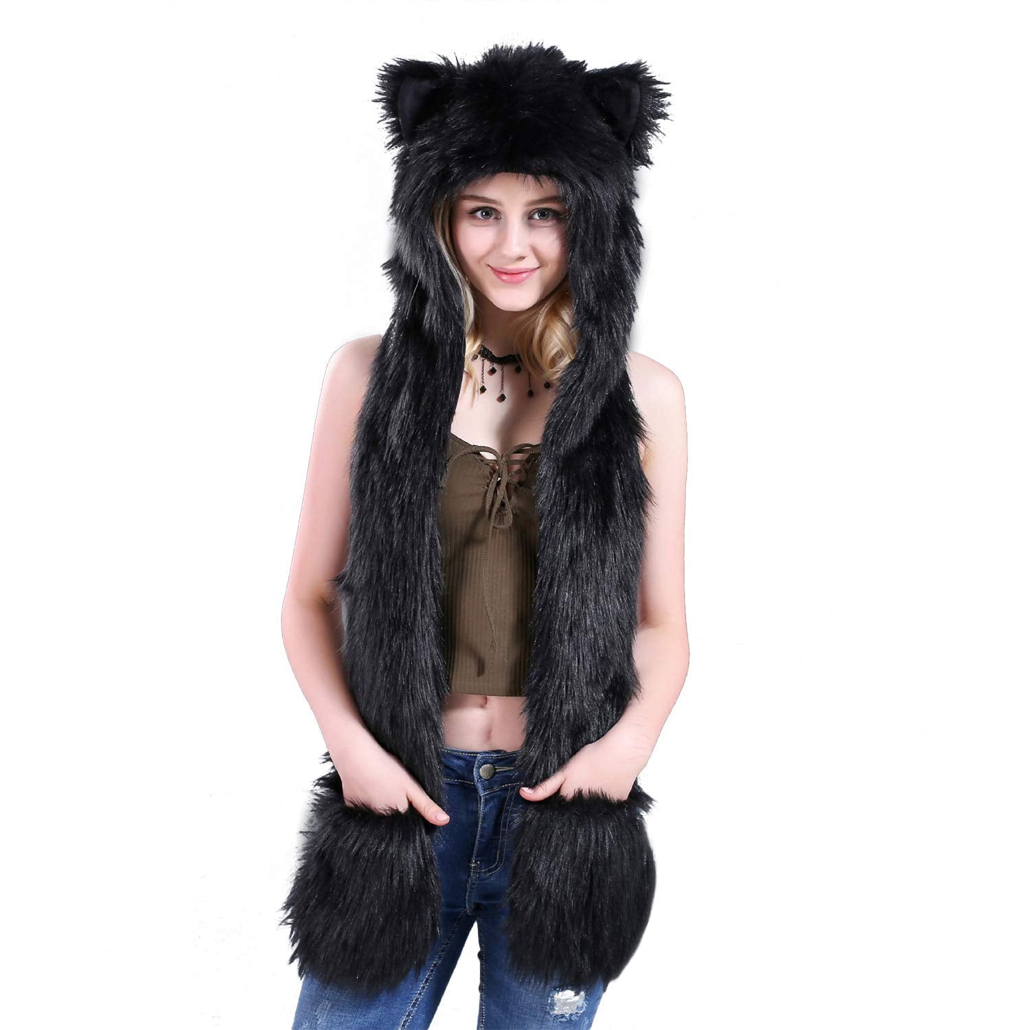 Women Faux Fur Animal Hood Scarf with Glove Pocket Winter Soft Warm Fuzzy Furry Hoodie Ear Flaps Hat, Scarf & Mitten Combo