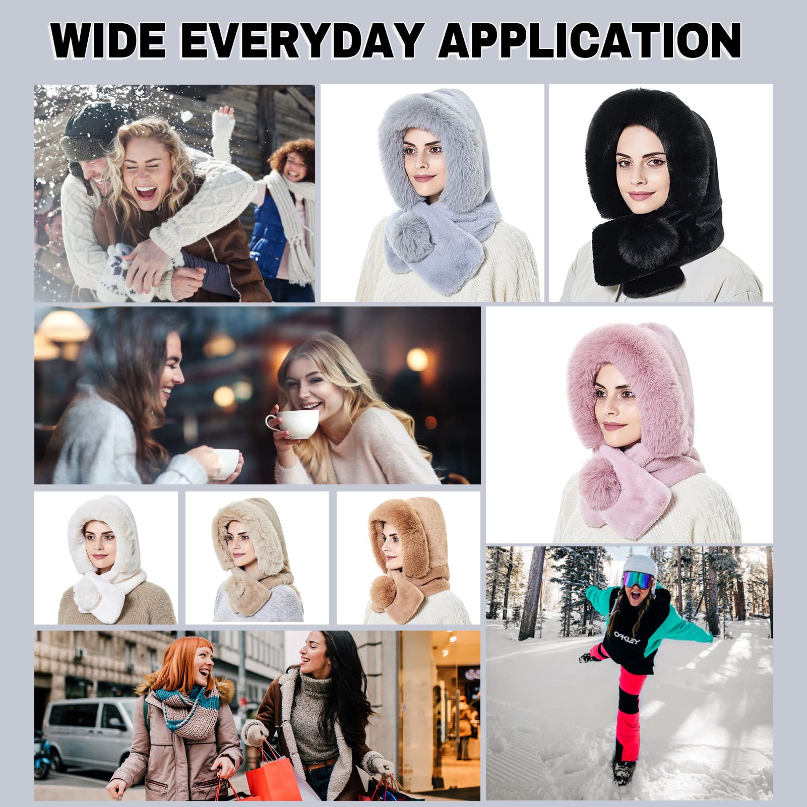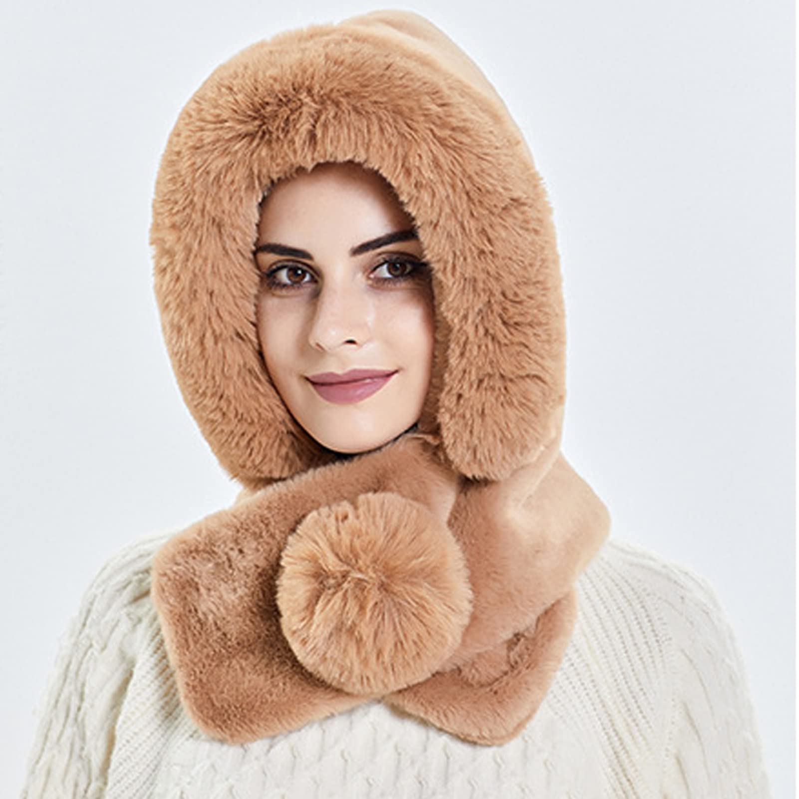 Women's Winter One-Piece Hat Scarf Warm Beanie Faux Fur Hooded Scarf Hat Skull Cap with Pompom