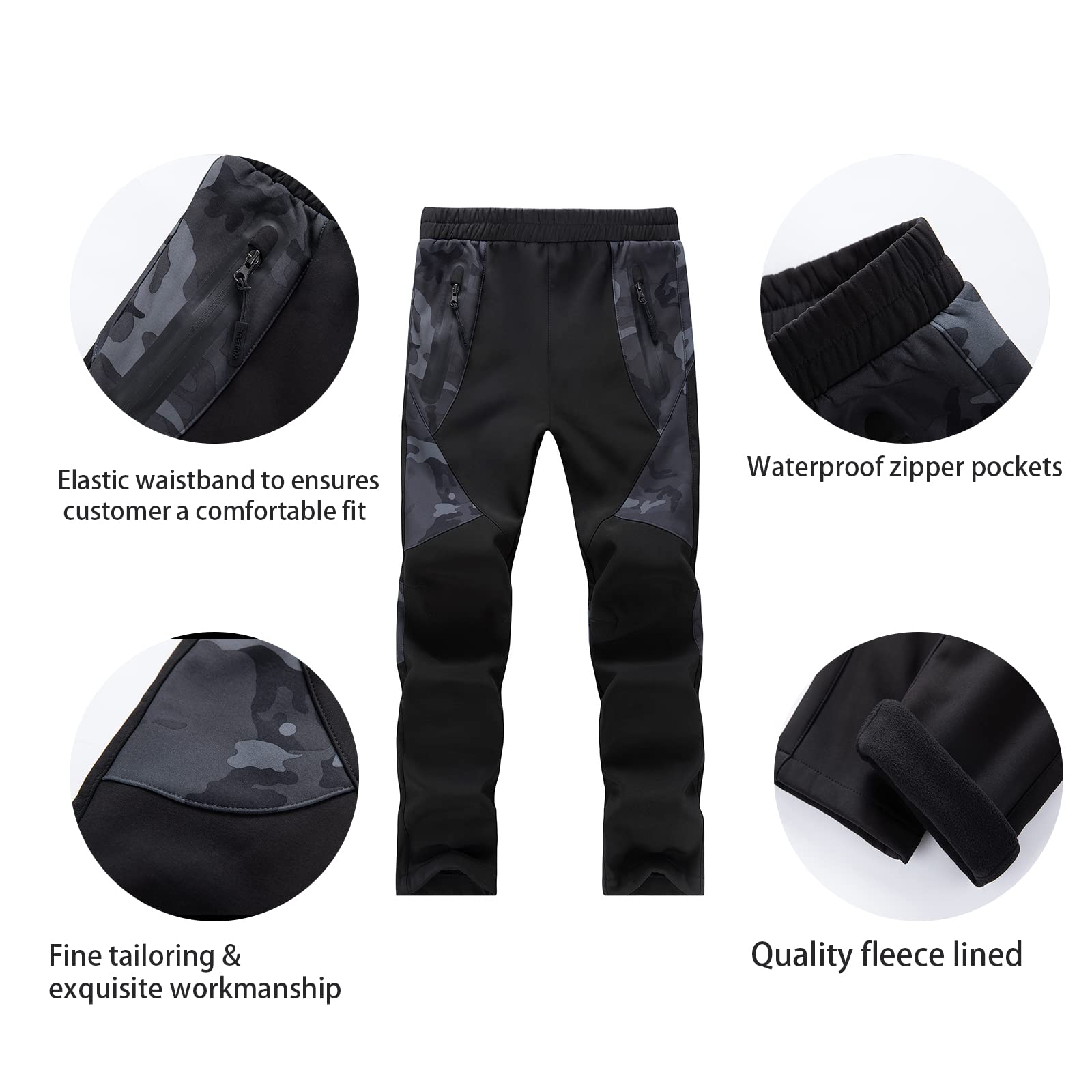 - Reinforce Outdoor design :The Winter Fleece Pants adopt elastic waistband to ensures kids a comfortable fit;Belt Loops design;High quality buckles & zipper closure;Two waterproof side zipper pockets,it can prevent rain and snow from entering the pockets;One back zipper pockets;These multi-pockets can help kids to keep wallet, key, cards,etc