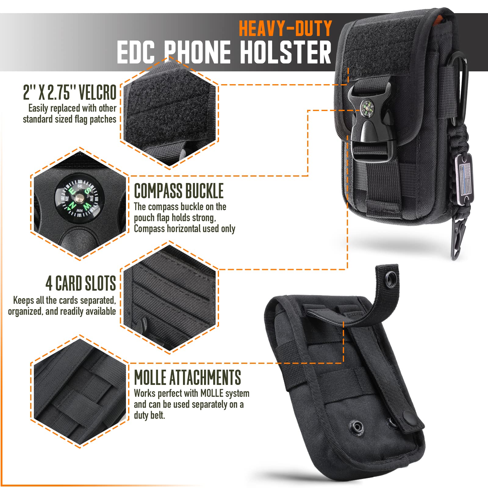 - INNOVATIVE BUCKLE WITH VERSATILE COMPASS: Tactical Molle Phone Holder has an innovation to the front buckle with a humanity design, a built-in compass on the buckle could lead you in the right direction when it's placed horizontally, EDC molle accessories for you.