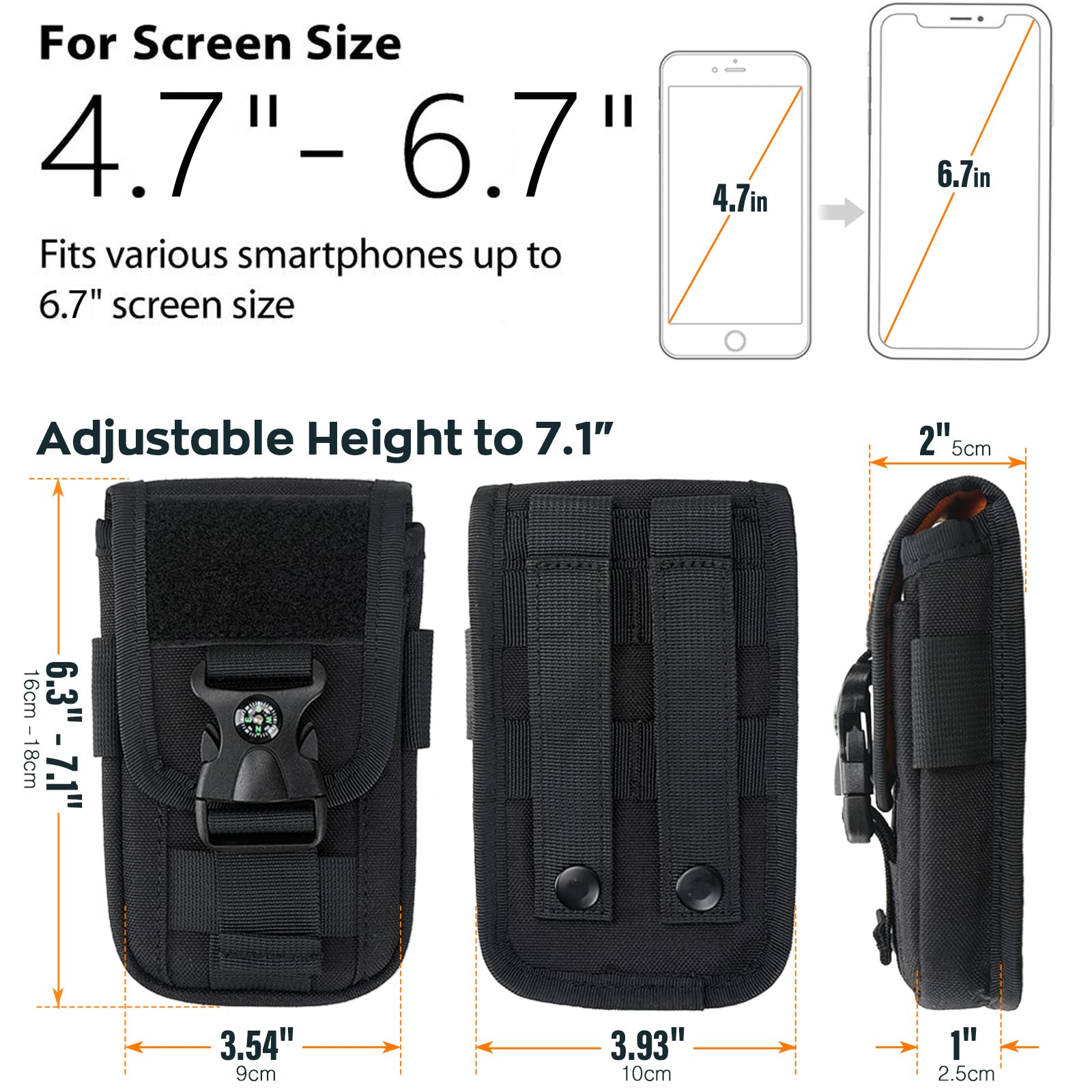 - EXPANDABLE HEIGHT: Tactical Phone Pouch has a front flap with adjustable height buckle strap fastening that can provide enough room for 4.7'-6.7' cell phone with a slim protective case on, like iPhone 14 Pro Max/14 Pro/13PM/13/12 / Galaxy S10/A53 / Note 10+ / Moto G Power / Pixel6, etc. Adjustable Height: up to 18cm / 7.1 inches.