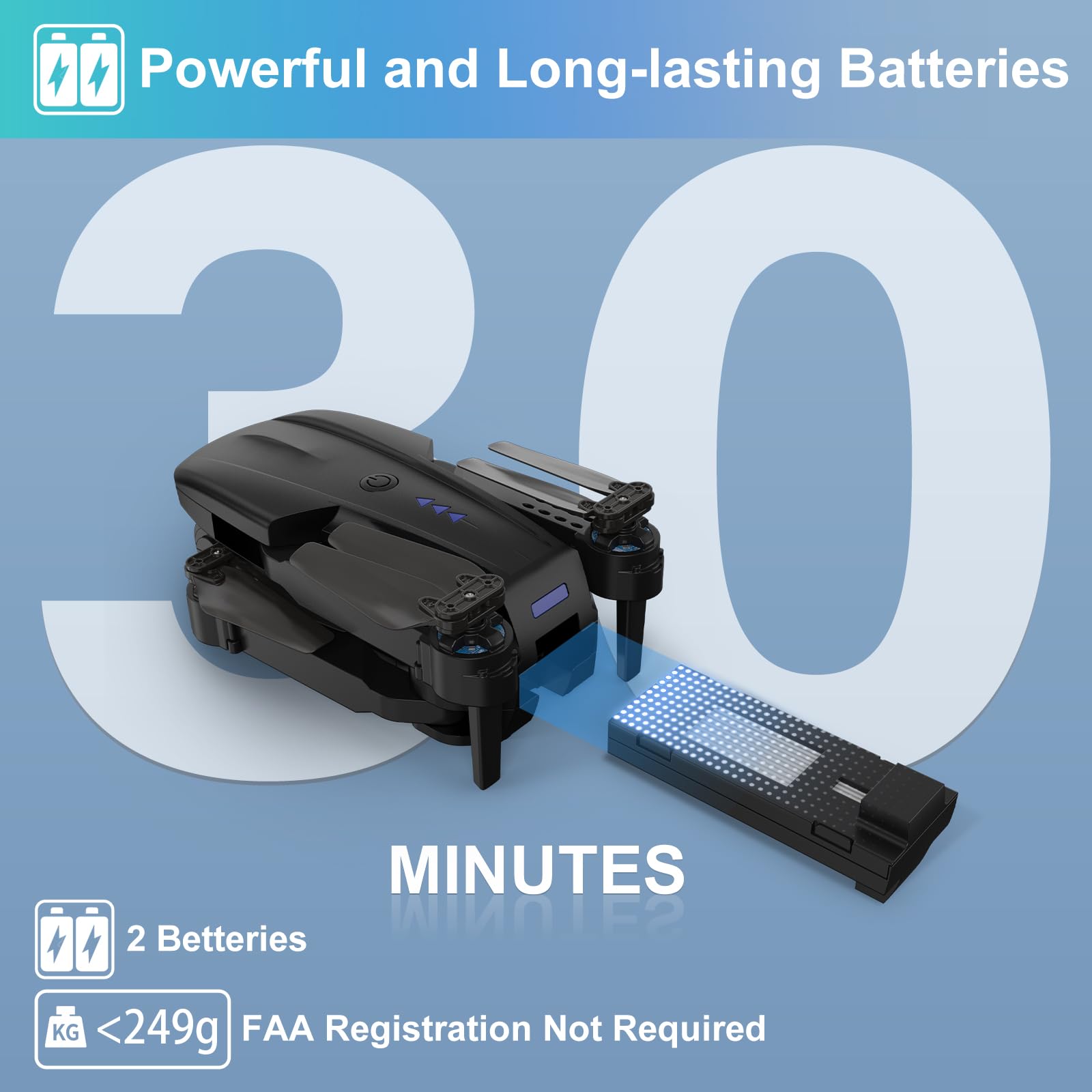 - Extended Flight Time: With two rechargeable batteries, this drone offers up to 30 minutes of flight time when both are fully charged. Its foldable design makes it easy to carry, ideal for travel. The carrying case lets you take the drone anywhere. For best performance, make sure to fully charge the batteries before each use.