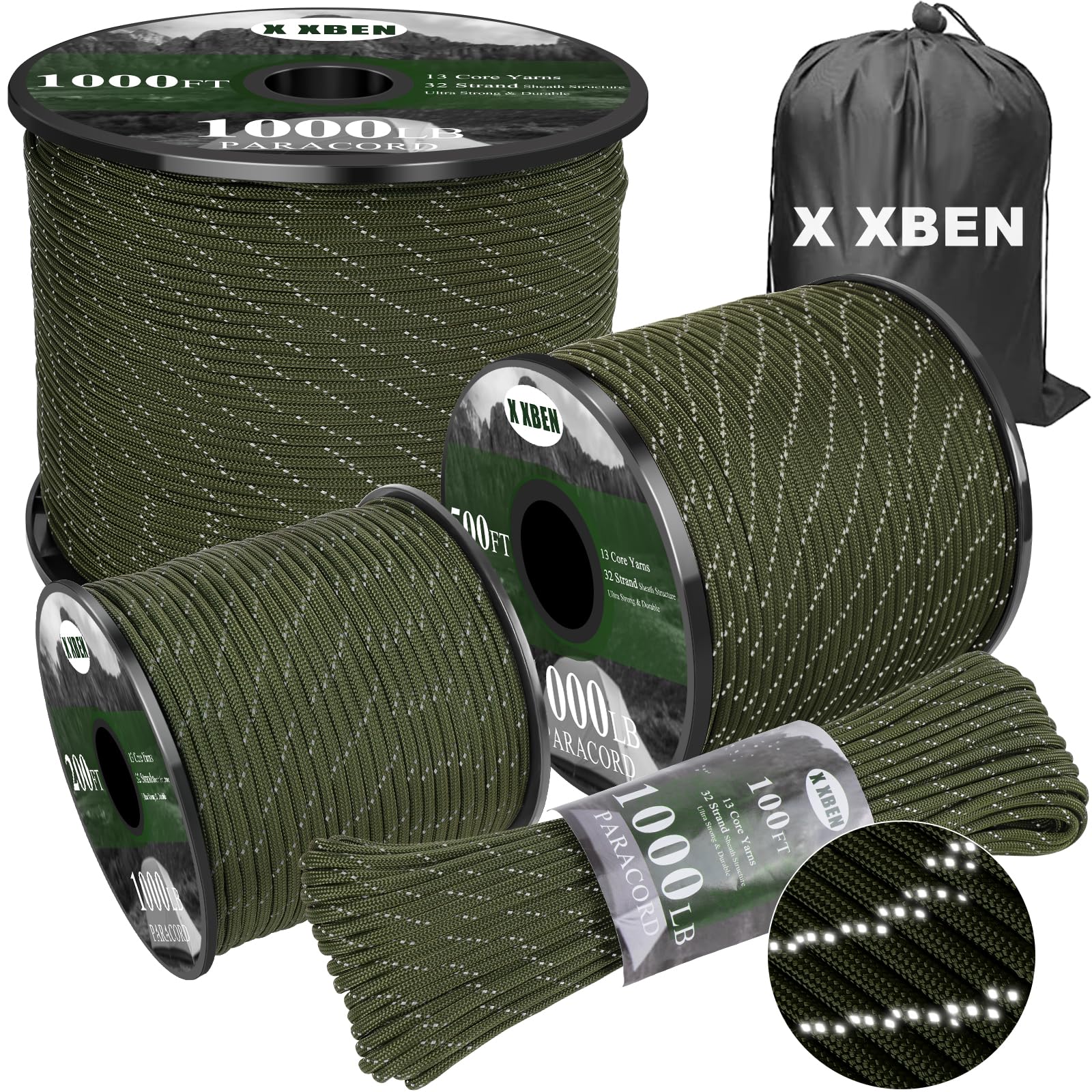 X XBEN Reflective Paracord 1000lb, 50/100/200/500/1000ft 4mm, 13 Strand Parachute Cord, Tactical Paracord Rope for Camping, Fishing, Clothesline, Hammock, Tent & Survival Bracelet, Army Green