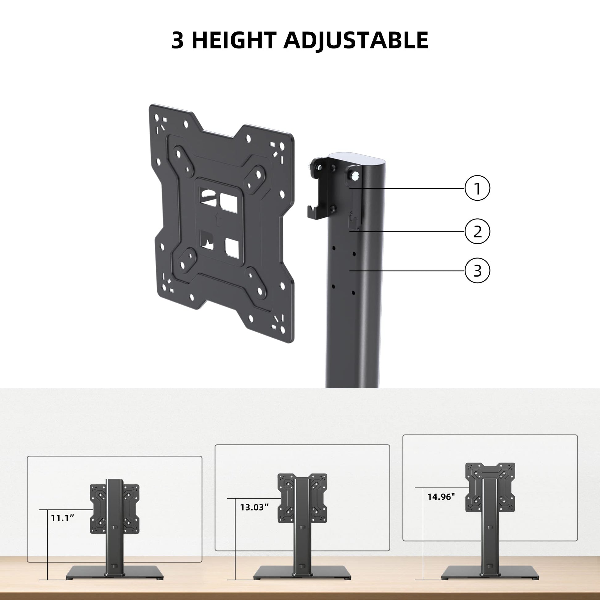 - 3 LEVEL HEIGHT ADJUSTMENT:This table top TV stand provides 3 different heights that can be adjusted to 11.1'/13.03'/14.96'. Tilt -12~5 degrees, can adjust to the best viewing flexibly.