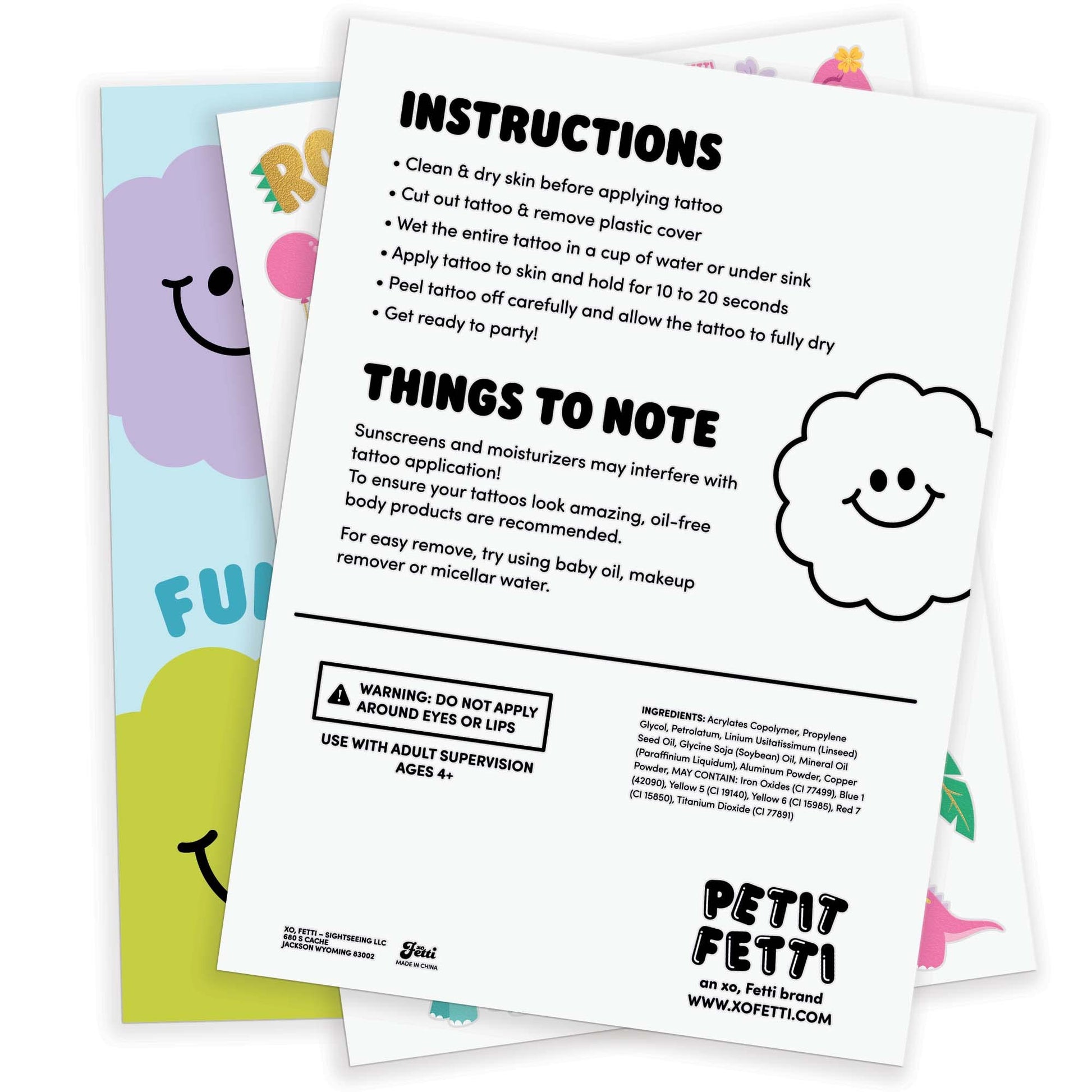 - Easy to apply: Place tattoo on clean + dry skin > Lightly dab the tattoo with damp paper towel > Remove paper, allow tattoo to dry and enjoy! Instructions included on back of each sheet :)