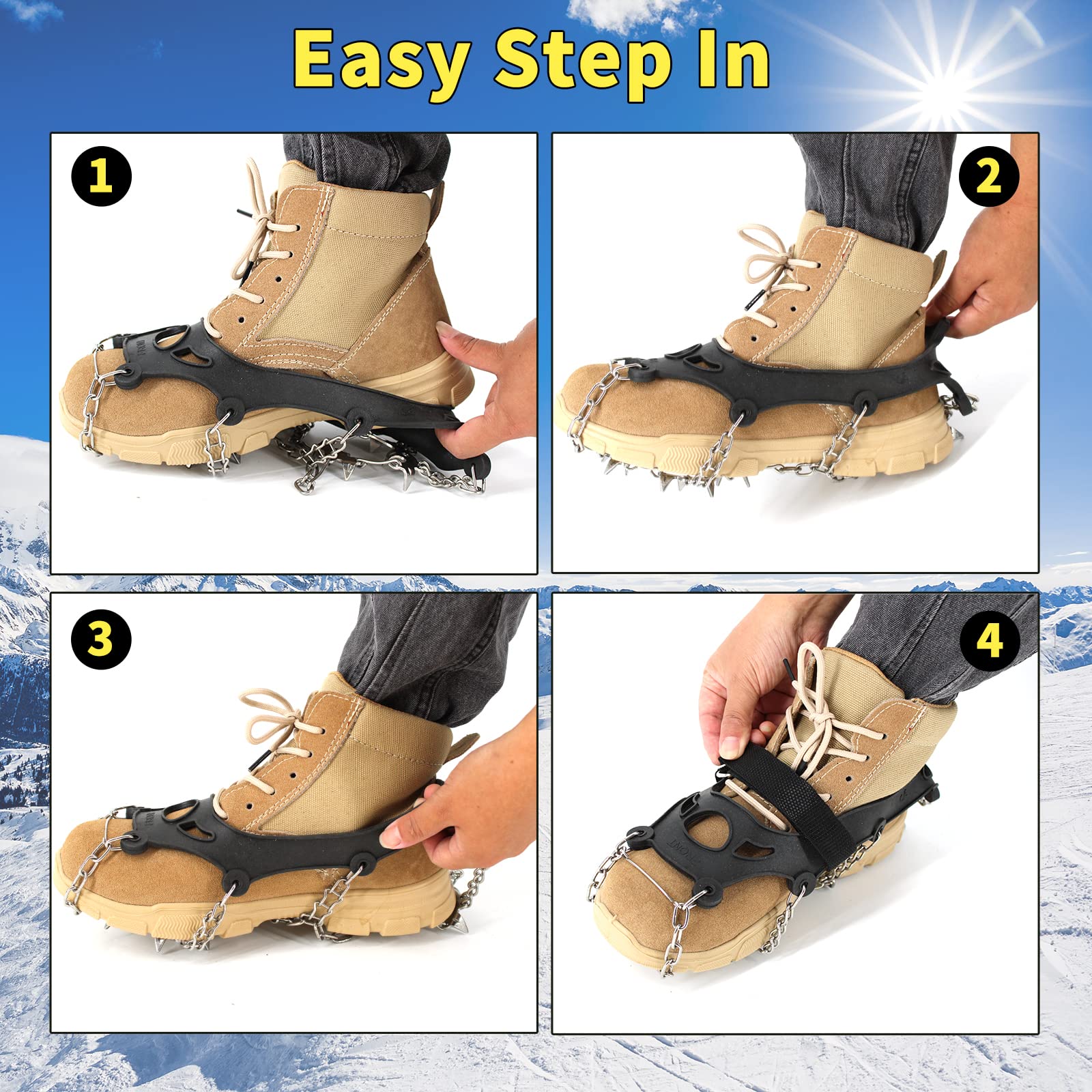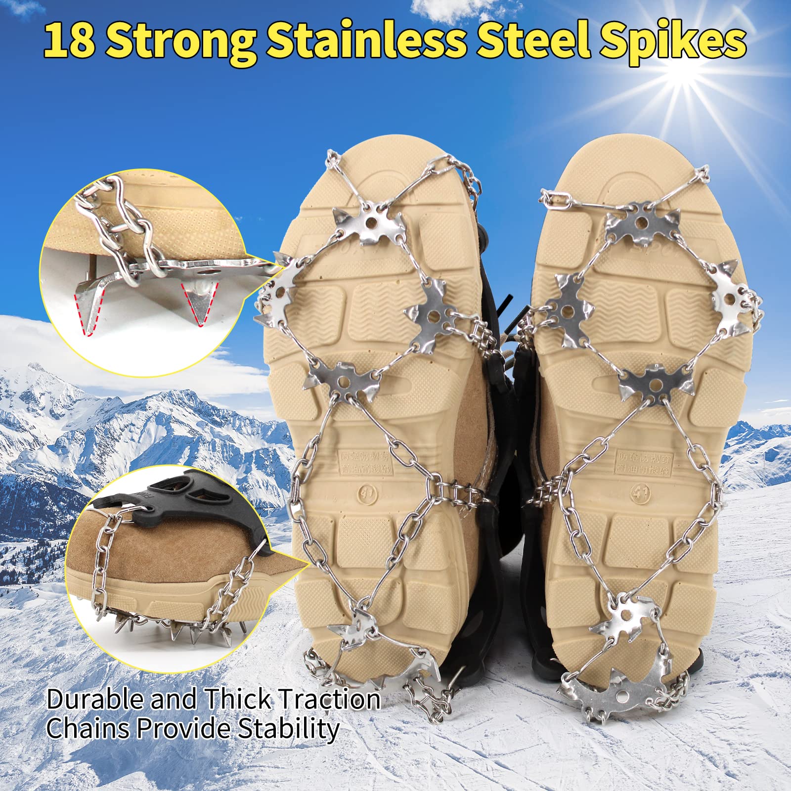 - 【Upgraded Strong Spikes】 Heavy duty stainless steel 18 spikes is abrasion and corrosion resistant, long-life usage. 360-degree spikes connected with chains provides strong traction. 12 spikes at the forefoot and 6 spikes at the heel ensures comfort and durability for you feet for long wearing.