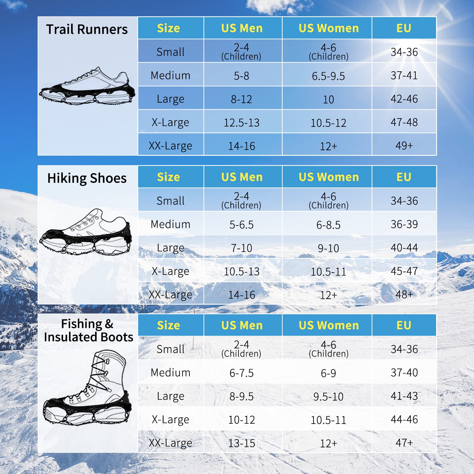 - 【Easily & Tightly Fit】 Quickly wear on the ice cleats and fasten the Velcro tightly when you are going to walk outside. Highly elasticity TPE rubber material is easy to stretch to fit different footwear. Lightweight & easy to carry in backpack. 5 sizes from small to XX-large, suitable for men or women of all ages.
