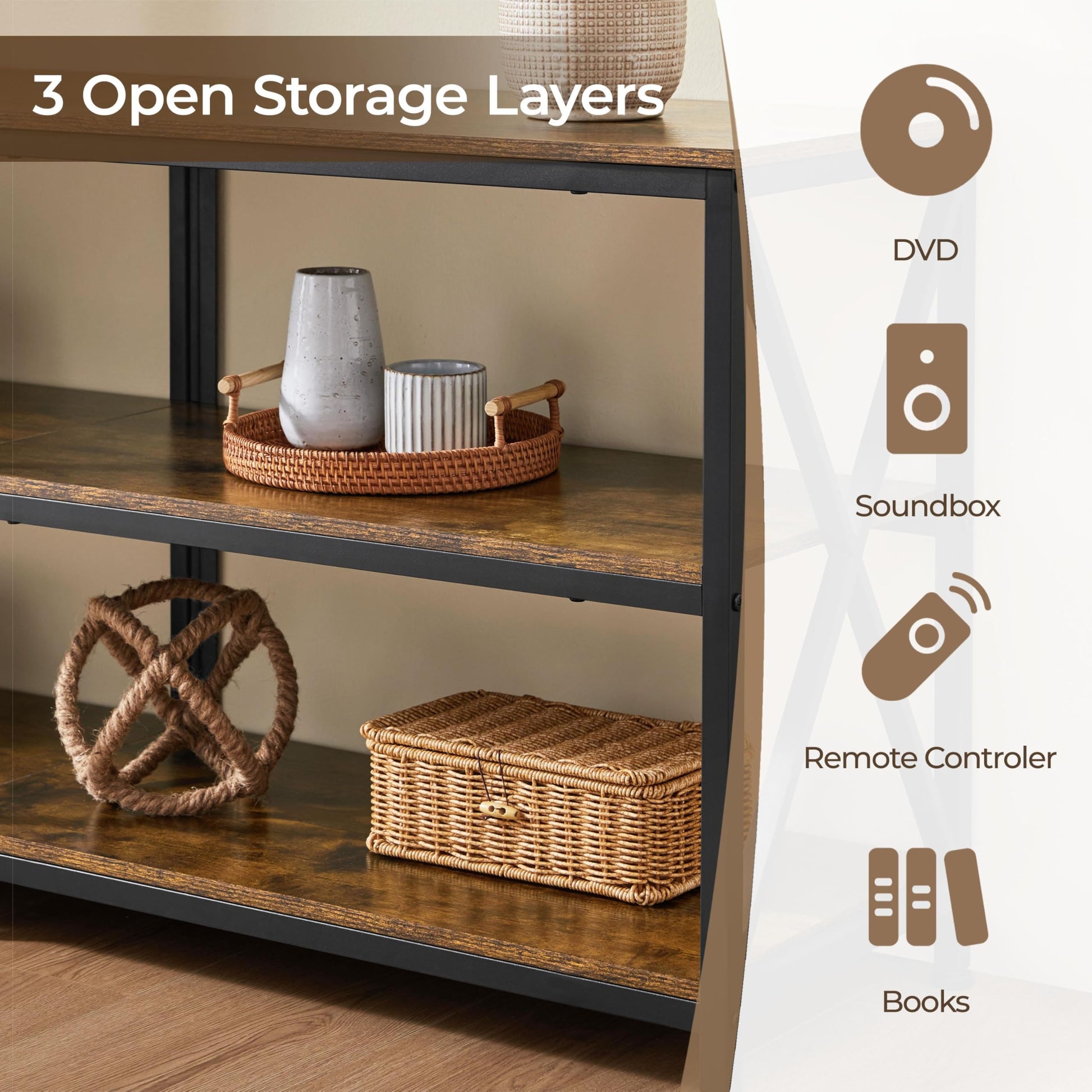 - Open Storage Breaks Application Boundry: Featuring a spacious tabletop and 2 open shelving, this TV console table is more than a simple TV stand. It can serve both storage and display anywhere that needs a practical storage unit, such as appliances and tableware in your kitchen, books, and collections in your study, or coffee set in an industrial or vintage café