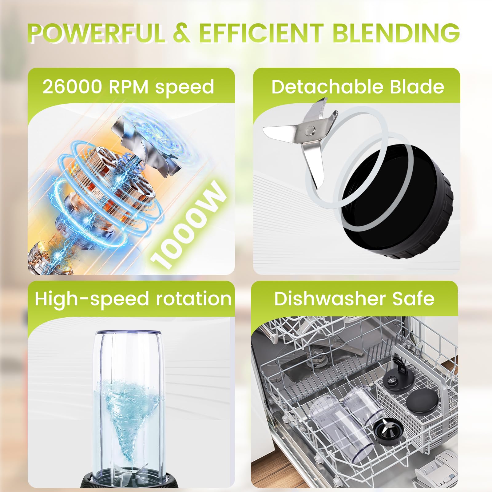 - 【COMPACT YET POWERFUL】 – This small yet mighty smoothie blender is perfect for limited countertop space. Equipped with a 1000W motor, it’s powerful enough to whip up your favorite drinks, making it ideal for daily protein shakes and smoothies.