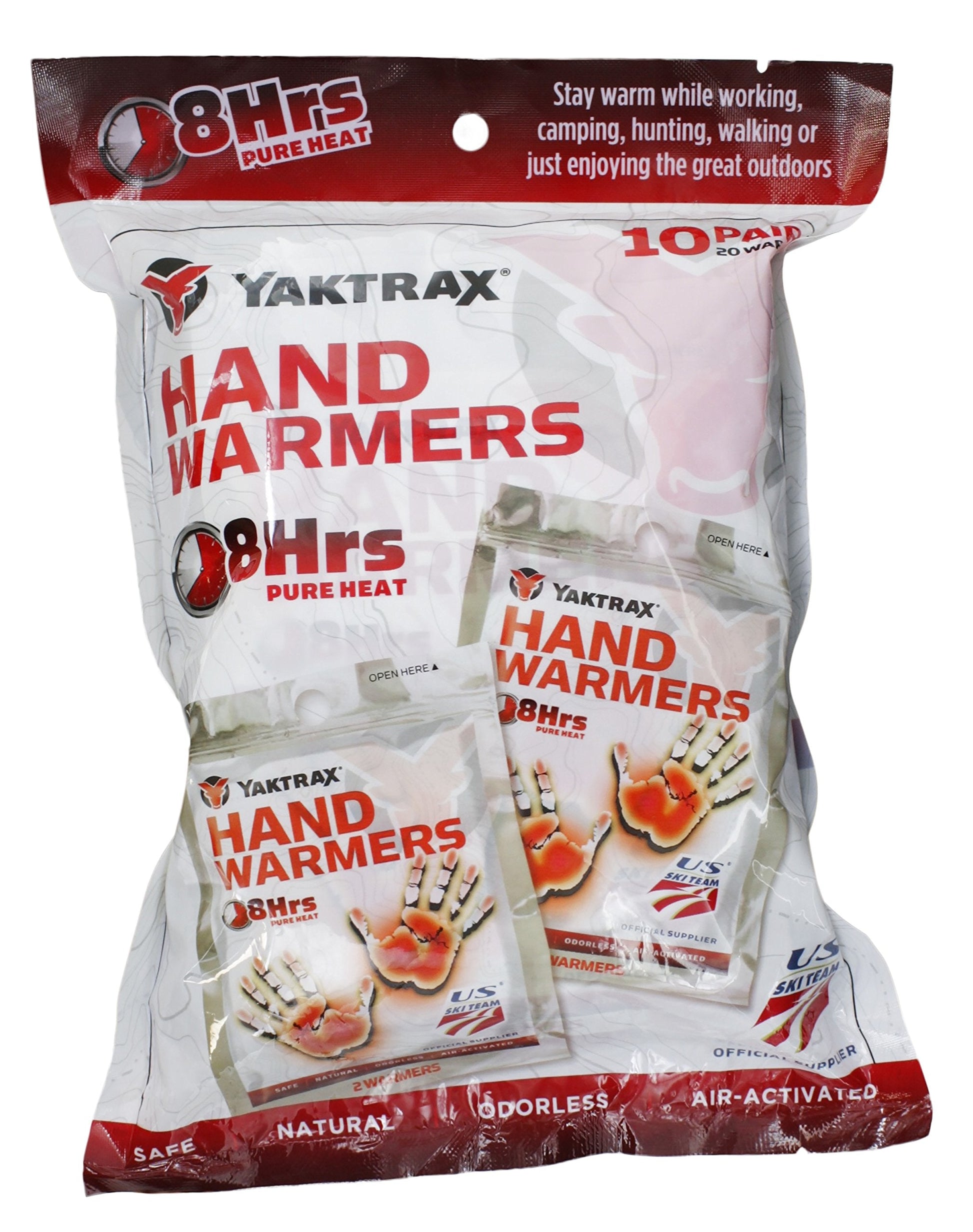 - 10 pair of single-use disposable hand warmers; each pair provides up to 8 hours of steady warmth