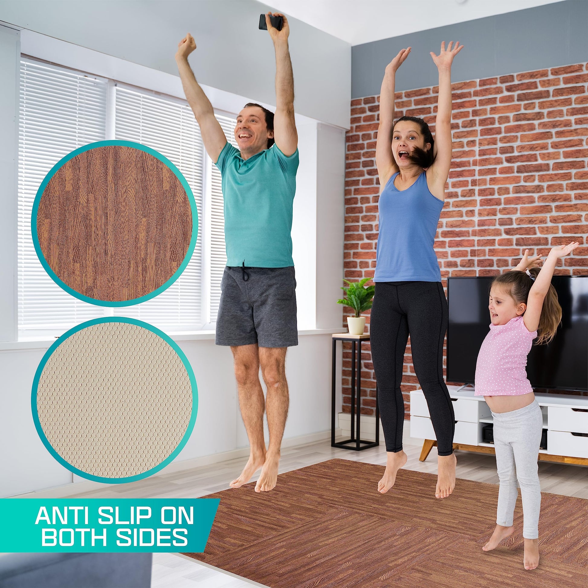 - CUSTOMIZABLE COVERAGE: Woof grain foam floor tiles set includes 12 foam tiles, covering 12 square feet; Easily assemble and adjust to fit your space requirements, whether it's a living room, home gym, basement, or garage