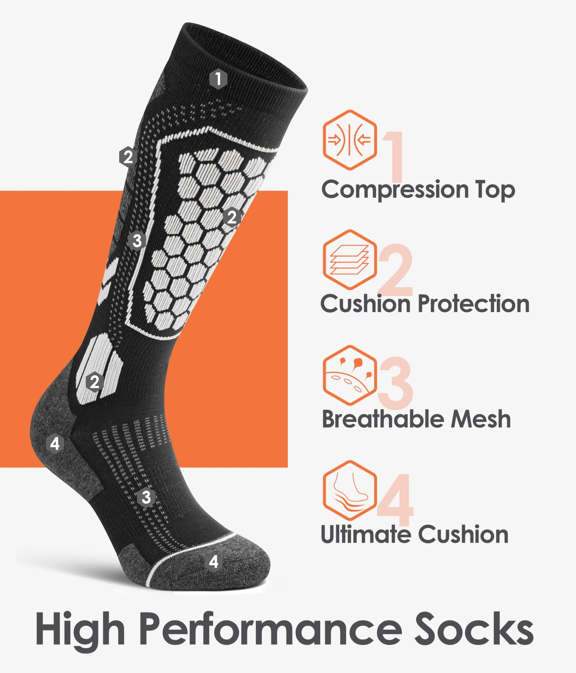 - Sensible and Effective Cushioning - Soft terry velvet cushioning is cleverly placed on the forefoot, heel and toe areas to provide the ultimate comfort for your feet. Targeted pads are placed on the shin to minimize friction and absorb impact. These high socks give you the extra-cushion you need for skiing.