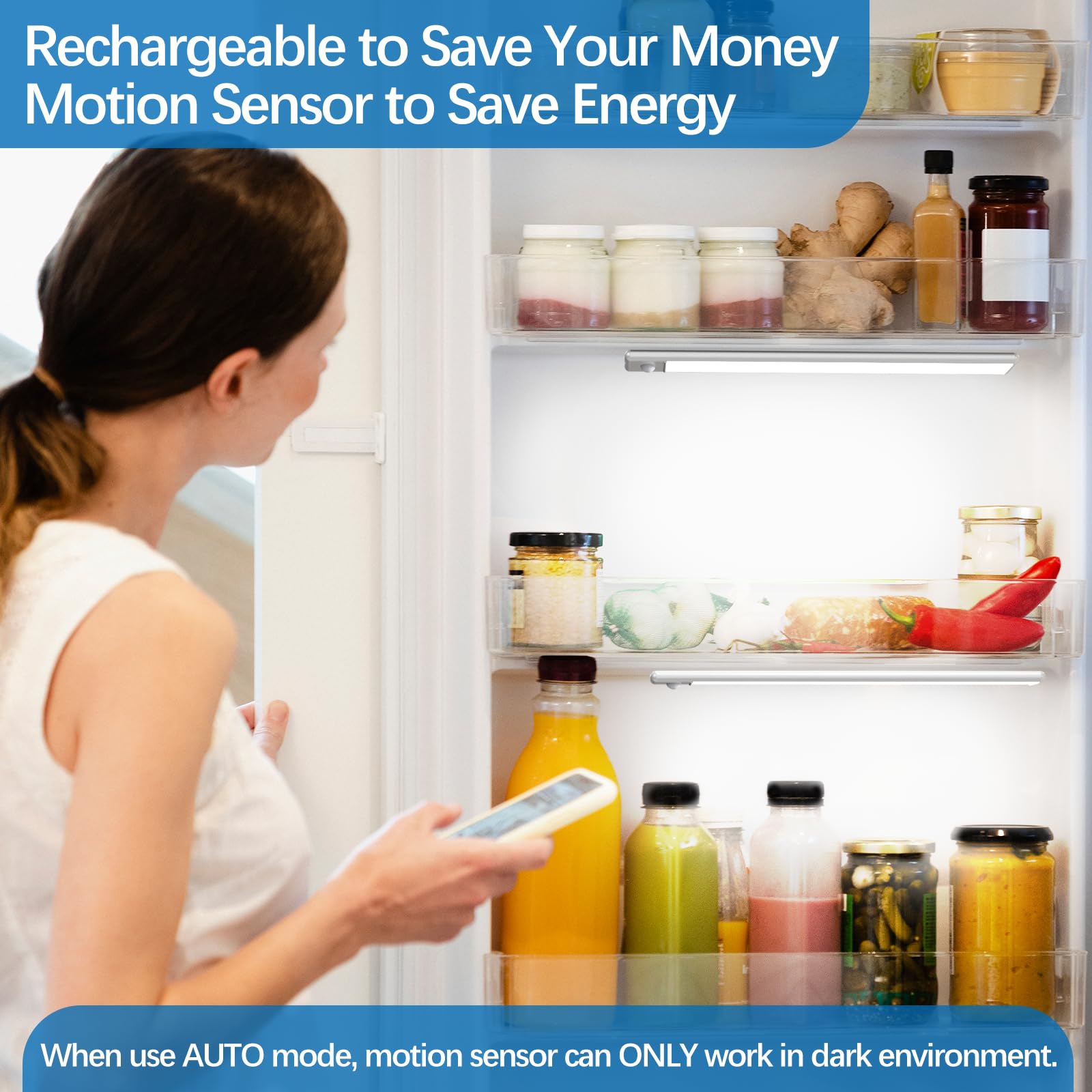 - Upgraded Motion Sensor: When use AUTO mode, Our motion sensor light indoor can auto-on within the detection area (Range: 10ft, Angle: 120°), auto-off after 20 seconds of no motion detected, helps prolong working time. The PIR motion sensor can only be activated in dark environment. When use ON mode, this under cabinet lights rechargeable can be kept on, you can also use it for camping or blackout (instead of flashlight). 3 Switch Modes: Auto/ On /Off