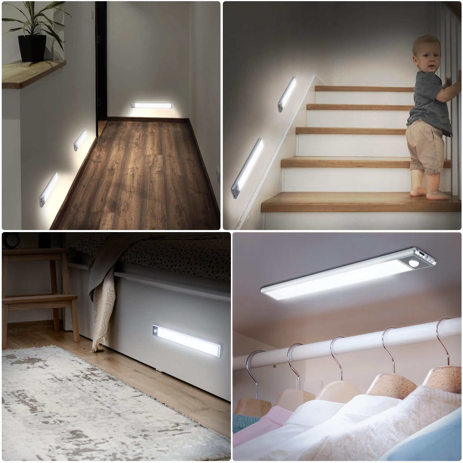 - Easy Installation & Multiple Uses: Built-in magnet, you can stick the led closet light motion activated to ironwork surface directly or via metal strip with non-marking tape; neither way will damage your precious furniture. Easy to install and remove it to charge. Ideal for closet, stairs, cabinet, wardrobe, bedside, drawers, cupboard, bookcase. When necessary, take the under cabinet lights wireless down for illumination at any time