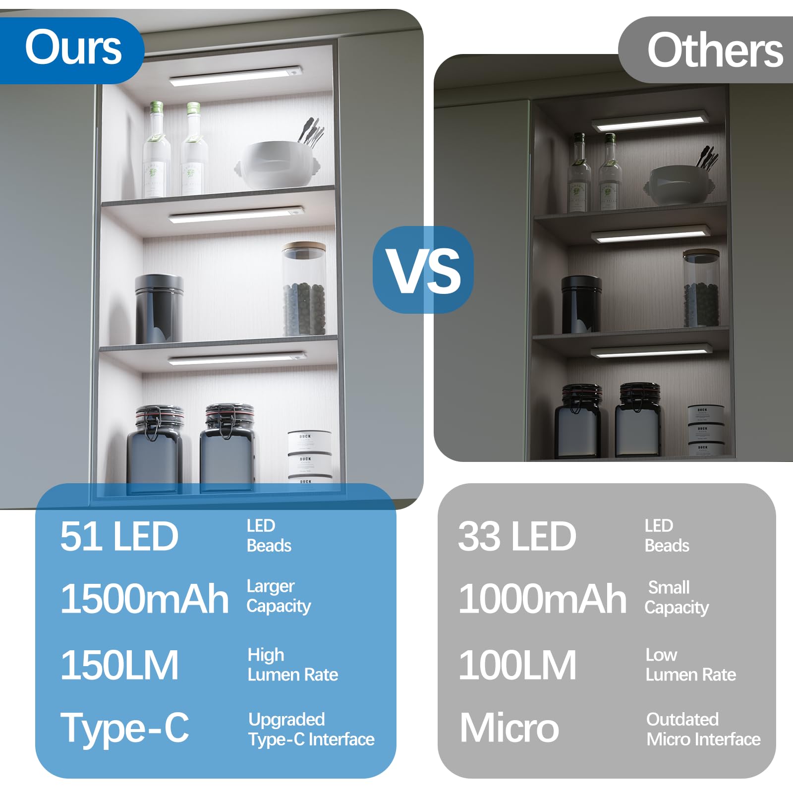 - USB Rechargeable: Built-in 1500 mAh high-capacity rechargeable battery, USB-C port can be easily fully charged in just 3 hours. After fully charged, these rechargeable under cabinet lighting last for 3-5 hours in ON mode and last up to 6 weeks in AUTO mode (Use 10 times per day) Charge occasionally but benefit daily