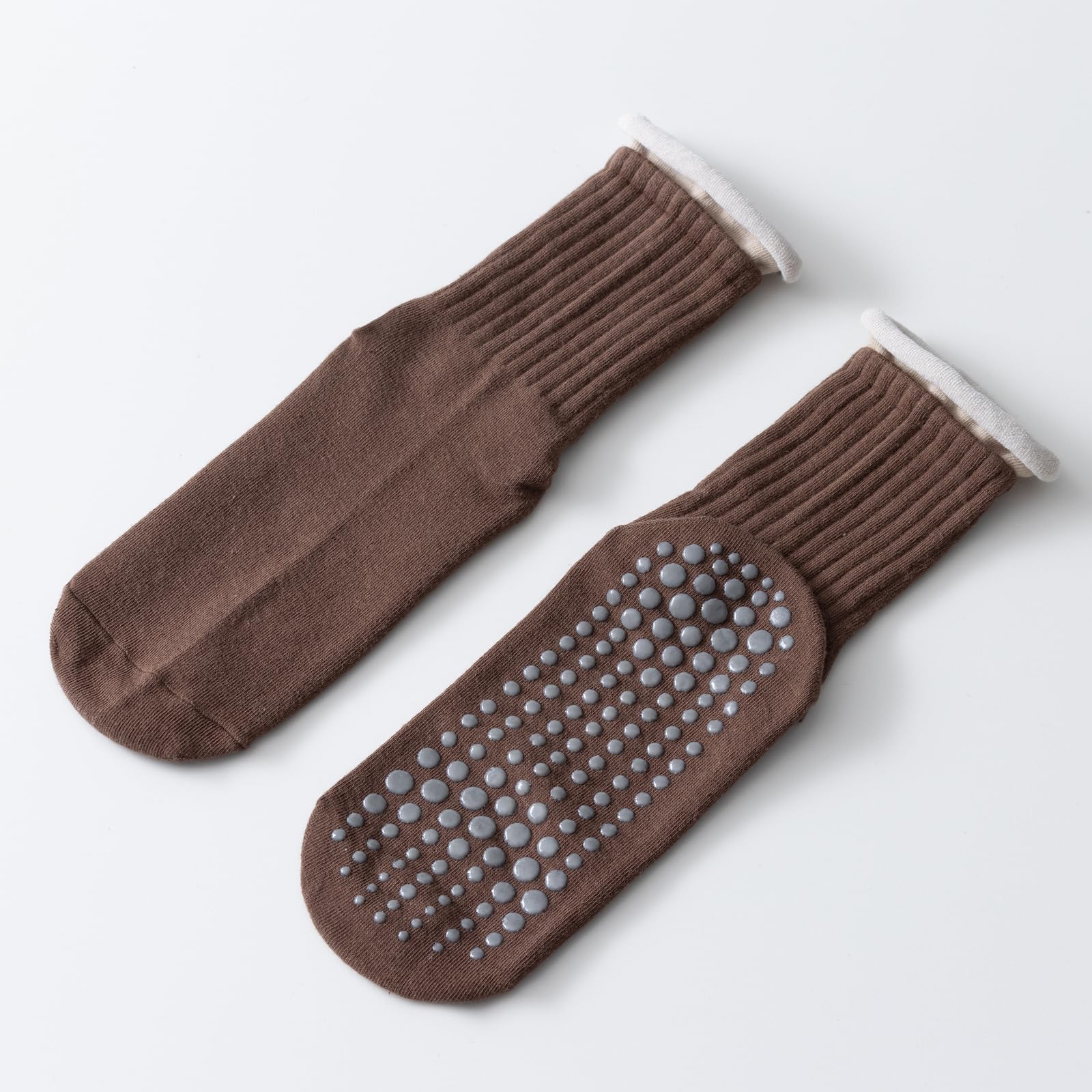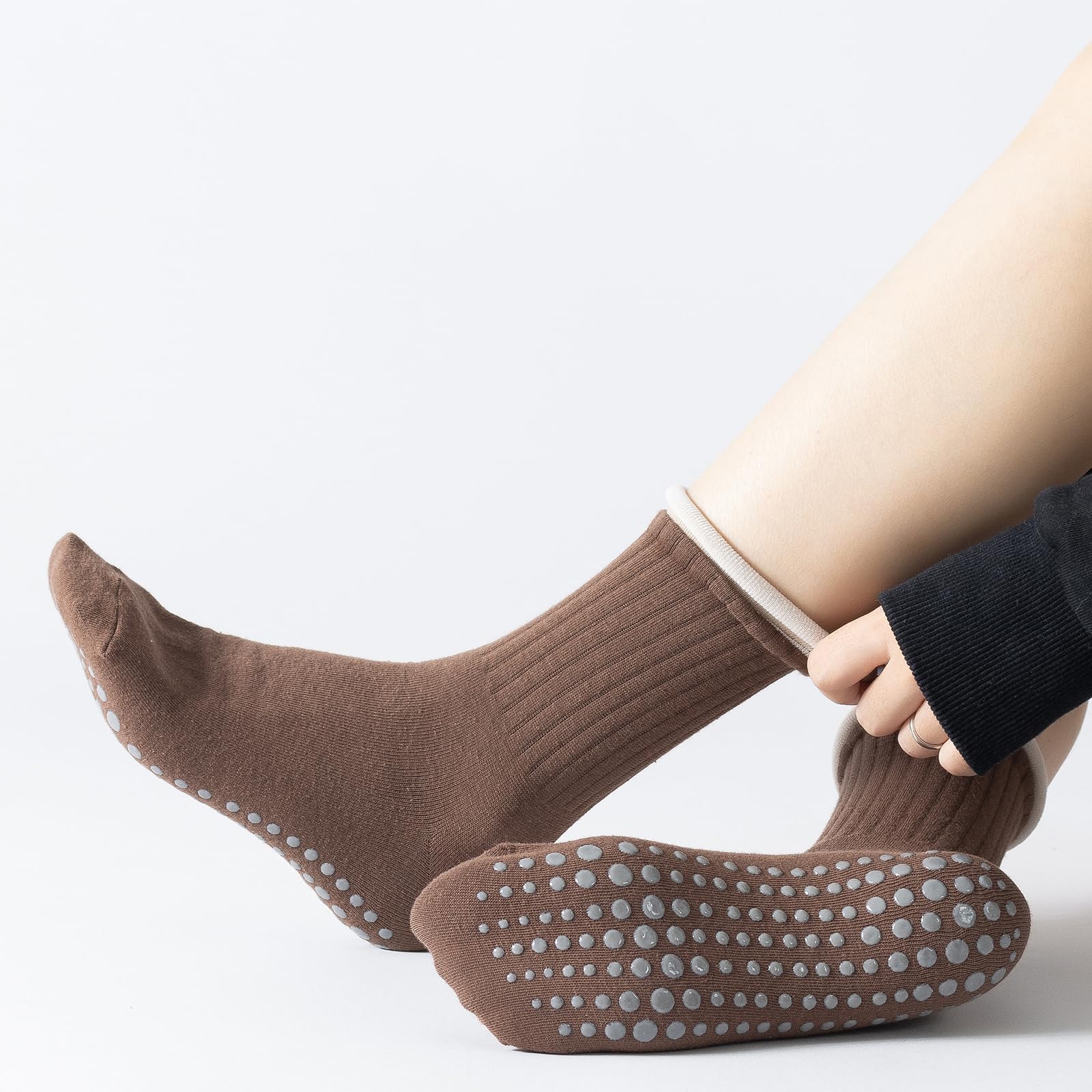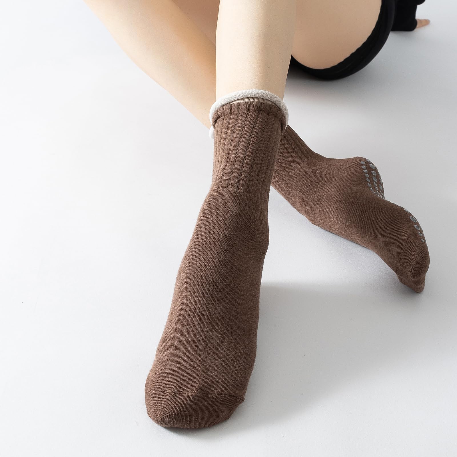 Yoga Pilates Socks with Grips for Women Non Slip Colorful Cushioned Crew Socks for Barre Ballet Dance (Dark Coffee)