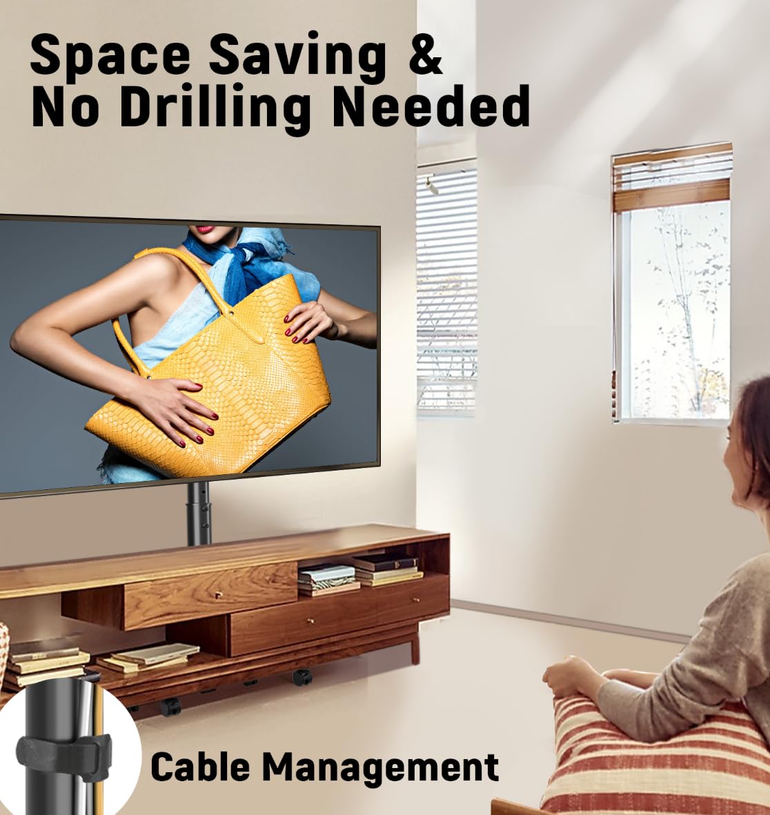 - ✔️ Convenient Mobile TV Stand or Floor TV Stand - Both movable wheels and adjustable Leveling Feet are provided, you can choose to use this tall tv stand as a tv rolling stand or tv floor stand, simple to change between two modes and fit your needs. This is an amazing solution to raising the TV off the table without drilling holes in the wall. It is attractive and modern, cable management secure the cord down the back of the center pole to keep tidy.