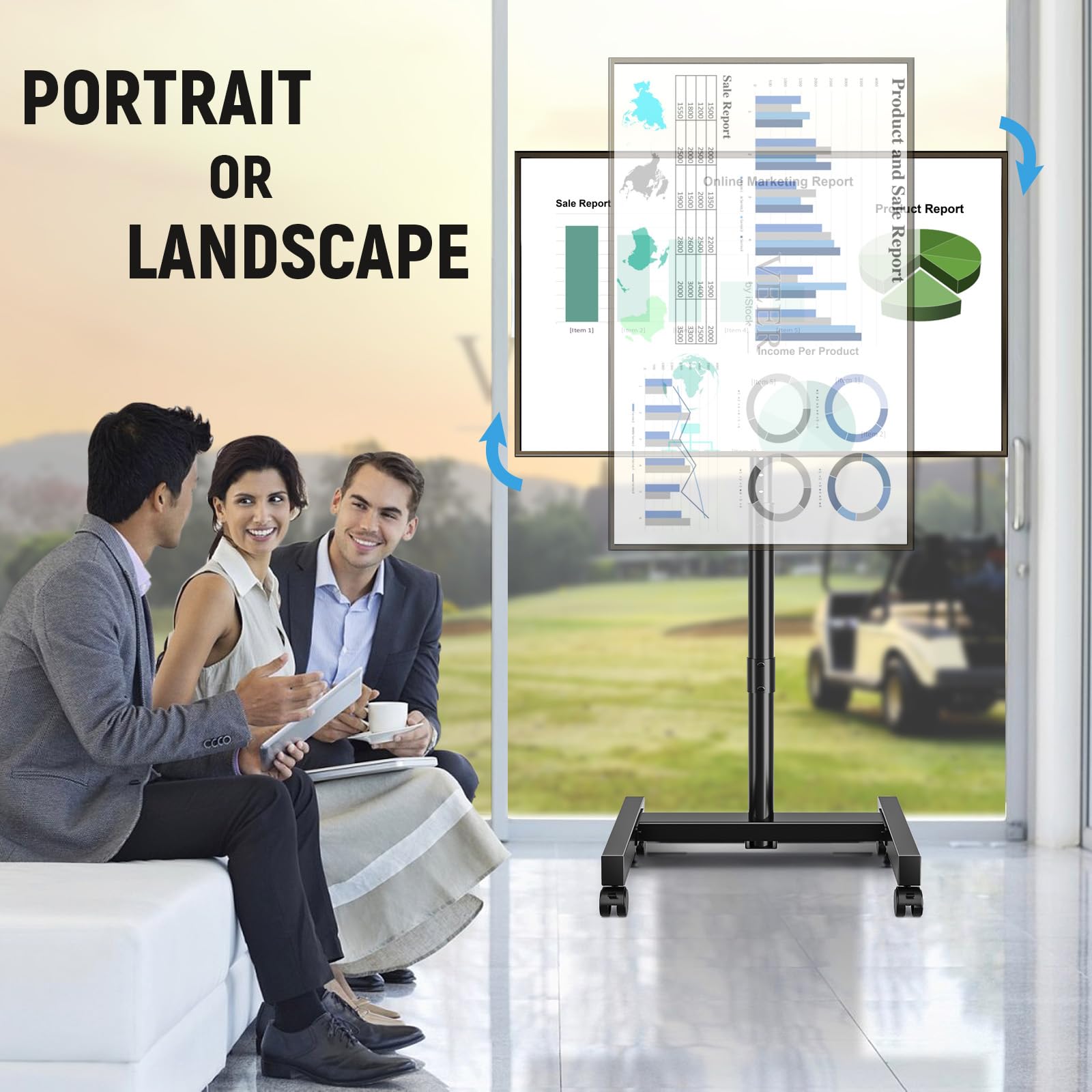 - ✔️ Flexible Screen Position for Best Viewing - TV mount stand comes with adjustable height feature allows you to find the perfect viewing position, whether you are sitting on the couch or standing in a different part of the room. Tilting feature is also nice so you can adjust tv cart to where is comfortable for you. Rotating feature let you easily switch the screen from horizontal to vertical for schoolwork or videogames or any combination.
