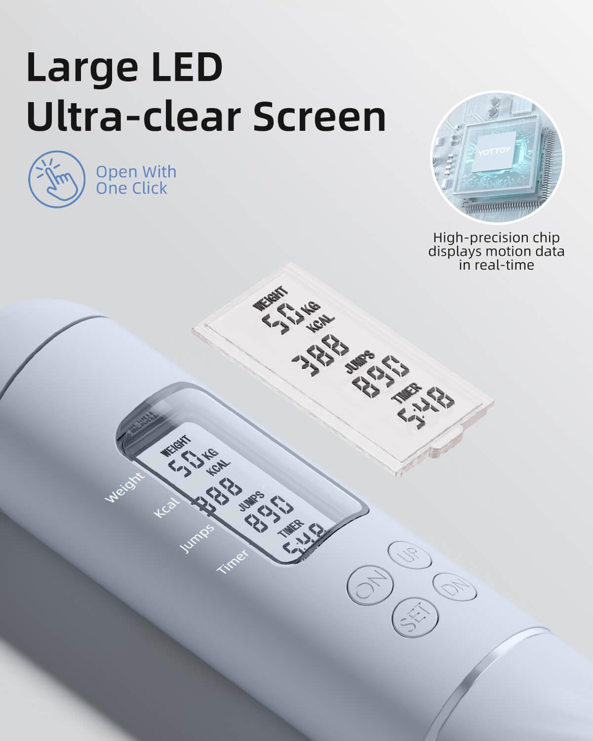 - 1.YOTTOY Jump Rope: We are dedicated to developing high-quality lightweight sports products. Our Electric Jump Rope features an HD LED display that shows the Timer, Weight, Calorie, and Circles. Set your weight and track time, number of jumps, and calories burned to achieve your fitness goals more effectively.