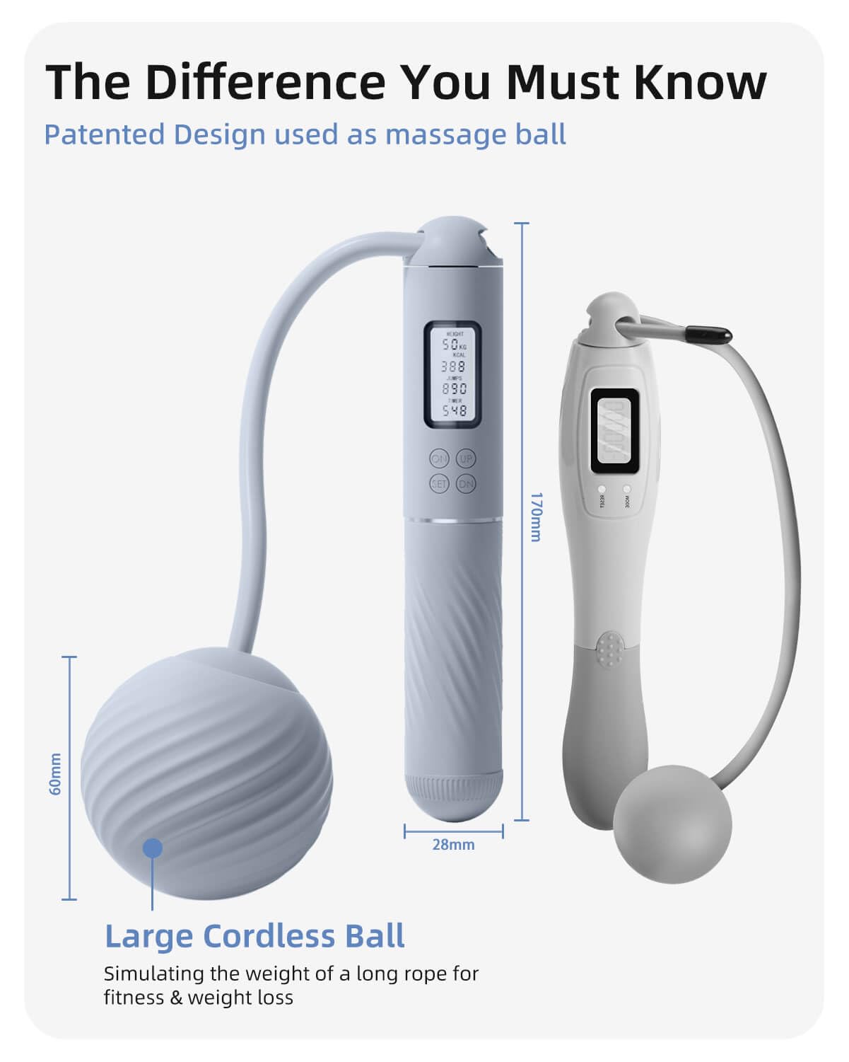 - 2.Patented 2In 1 Design for Stability: Our innovative design includes a large cordless ball that ensures the rope won't easily fall. The external thread of the ball doubles as a massage ball, simulating the weight of a long rope for fitness and weight loss. Additionally, two removable counterweights enhance fat burning and accelerate sweating.