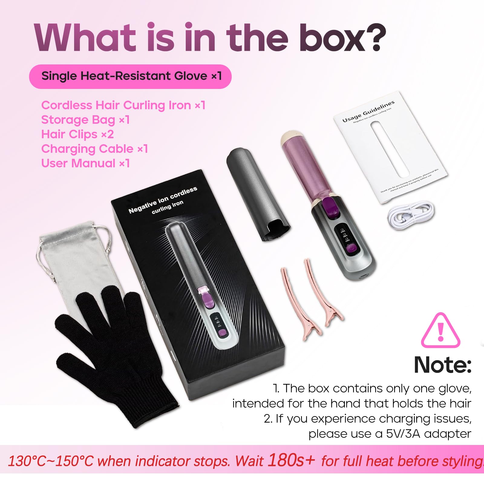 - 【Negative Ion Care for Healthy Styling】This cordless curling iron emits negative ions to help reduce frizz, protect hair from heat damage, and enhance shine. Perfect for smooth curls at home or on the go.