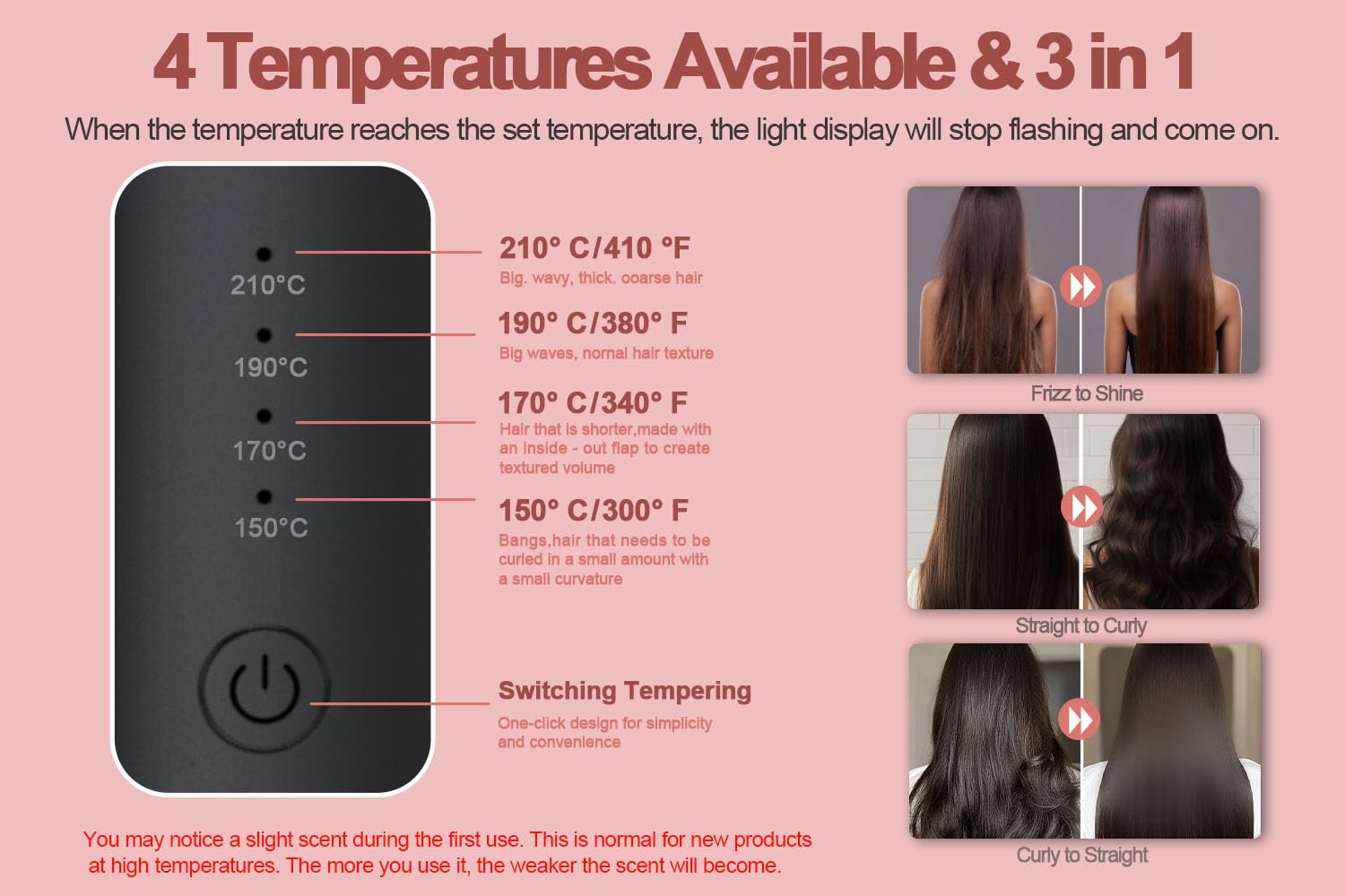 - 【4-Level Temperature Control】The rechargeable mini hair curler has four adjustable temperature settings to suit different hair types, helping you achieve perfect curls or sleek straight styles. For the best results, allow the device to fully reach the set temperature before use for optimal styling.