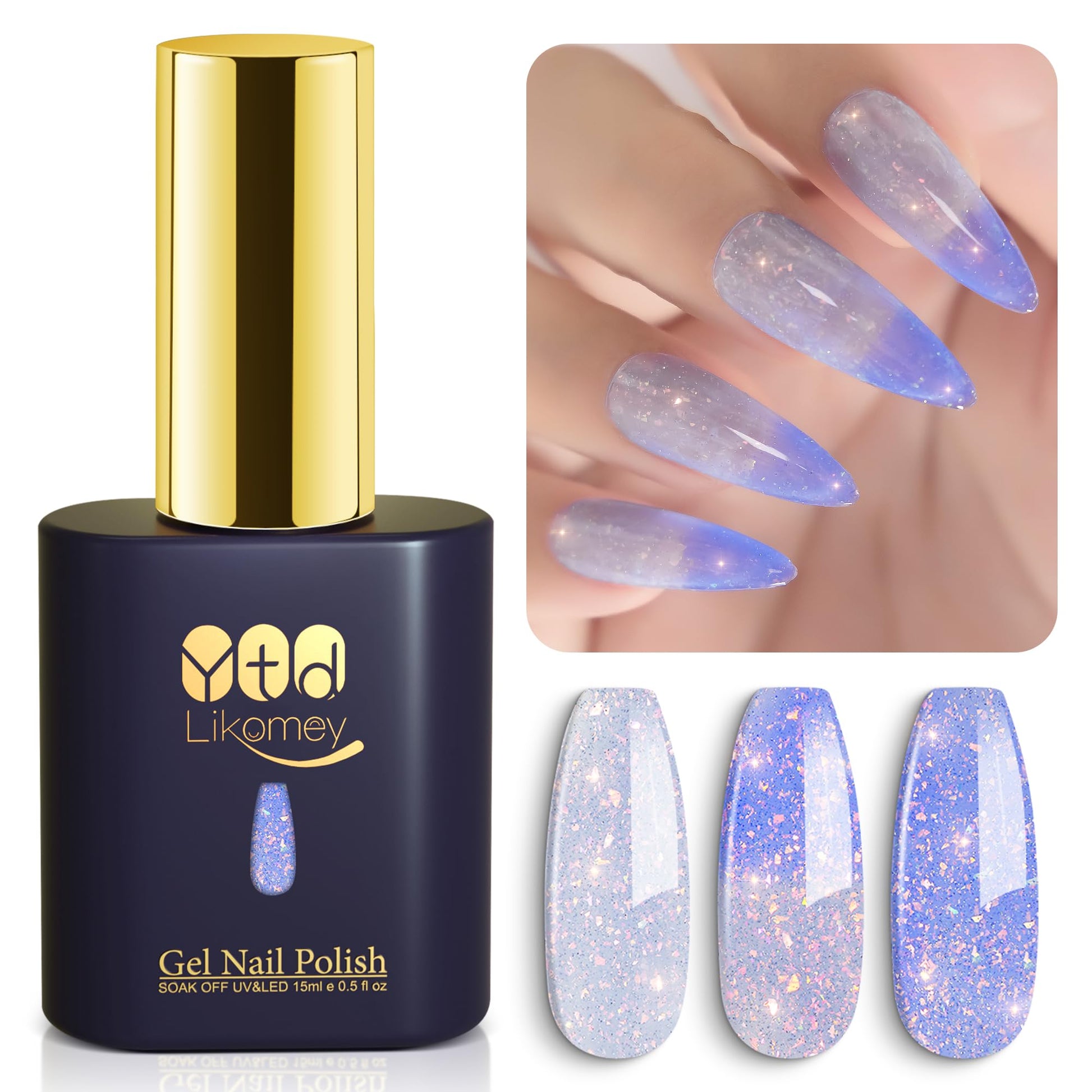 YTD Likomey Brocade Glitter Color Changing Gel Nail Polish,15ml Light Blue To Blue Shimmer Mood Temperature Change Colors Iridescent Flakes,Spring Summer Thermal Ombre UV Nail Gel,WB354