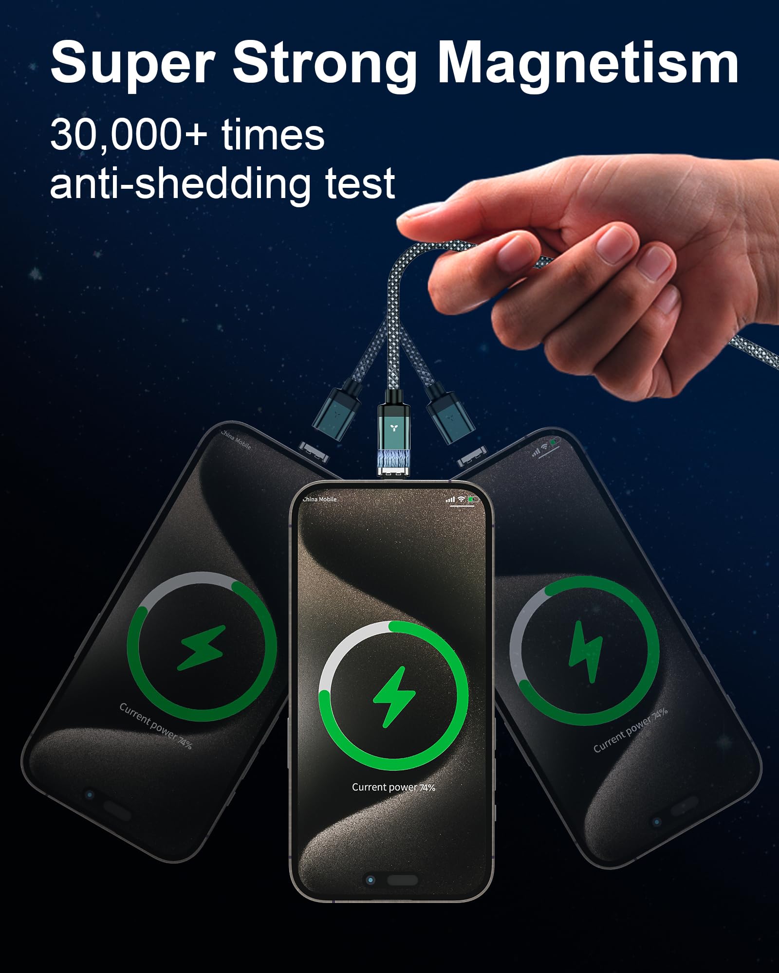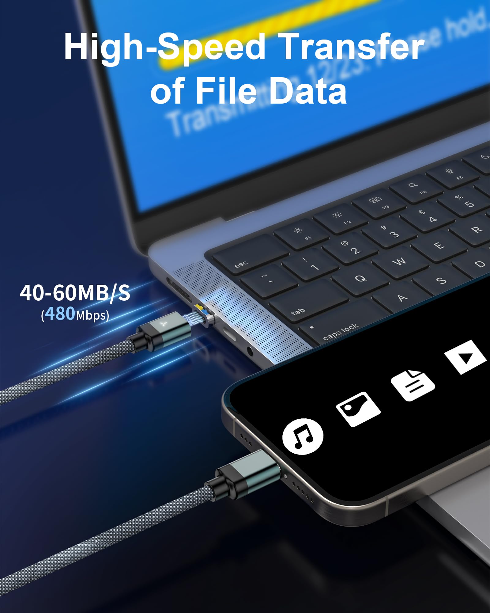 - PD 100W Fast Charge:The magnetic charging cable upgrade PD 100W tech takes charging speed to the next level. Type-C output: 20V, 5A Max (100W) with the PD charger, IOS output: 9V, 3A Max (27W) with the PD charger, which ensured by high-speed safe charging, 3 x faster than the general USB-C cable. Support PD,QC3.0 fast charging protocol.480 Mbps data transfer speed.